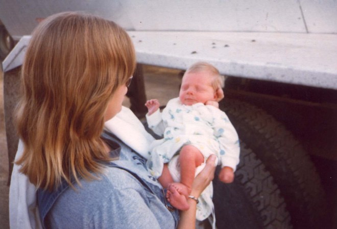 These wheels tell me much more though. This photograph was likely taken at the Amalgamated Sugar Company’s factory at Paul, Idaho. If the photo was taken by my Dad, I am not sure a semi trailer would be so close. A pickup, office, or something else may have been closer. This shot was likely taken by my Grandma, because she worked as a dispatcher at the Paul factory for Circle A Construction then. Those trucks and trailers parked only feet from where the trailer was located. Furthermore, that trailer was so small that a good first photograph by my Grandma probably would have required a little more space and light. Hence, my Mom is likely standing outside the trailer, my Grandma taking the shot, looking down at the new mother and baby. The semi is also parked driving from left to right, which is the same direction those trucks drove and parked. Dad will probably clarify if it was him who took the shot, but I have a pretty good suspicion it was Grandma. Not only is Dad in the shot, but Grandma is too.