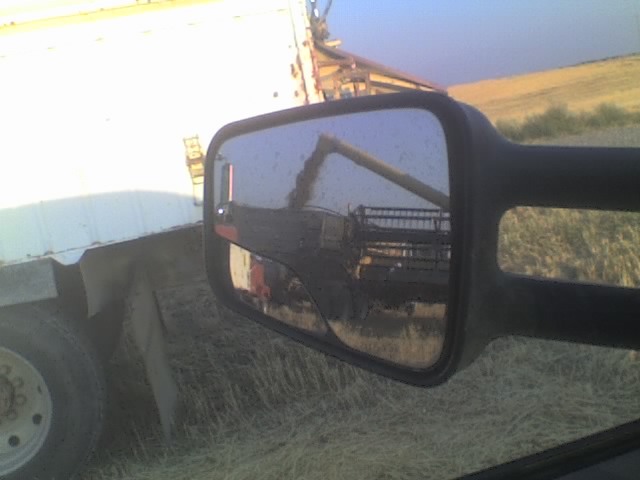 The photo captures Durum wheat being offloaded from the 20-year-old New Holland combine into my truck, a 1987 Volvo White. The other little mirror captures the front of a red 1985 GMC General. Outside the mirror is the back of another truck waiting to be loaded. Off in the distance behind the truck waiting in the overall picture, a completely harvest field awaits its next phase; probably baling of the straw and preparation for winter.