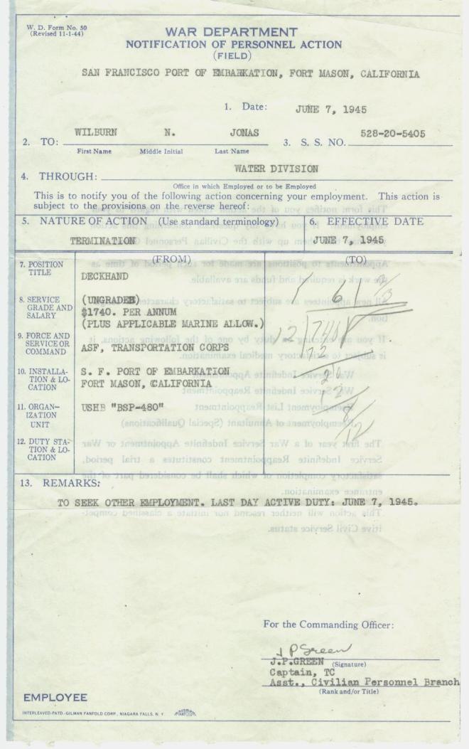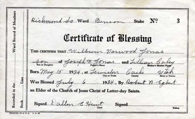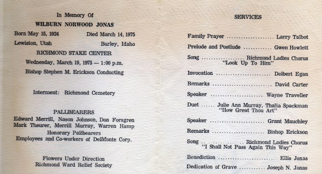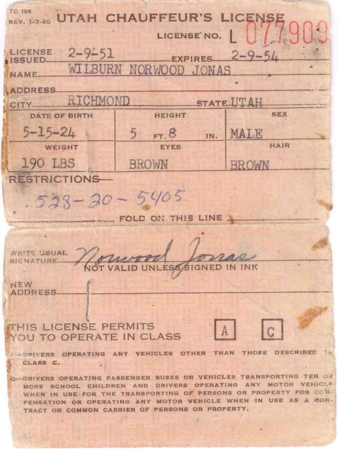 Wilburn Norwood “Nor” Jonas was born 15 May 1924 in Lewiston, Cache, Utah to Lillian Coley and Joseph Nelson Jonas. The fourth child of eight to his parents. He married Colleen Mary Andra 27 September 1946 in Elko, Elko, Nevada. Three children were born to him and Colleen; Douglas in 1952, Sandra in 1954, and Jackie in 1960. He died 14 March 1975 in Burley, Cassia, Idaho and was buried 19 March 1975 in Richmond, Cache, Utah.