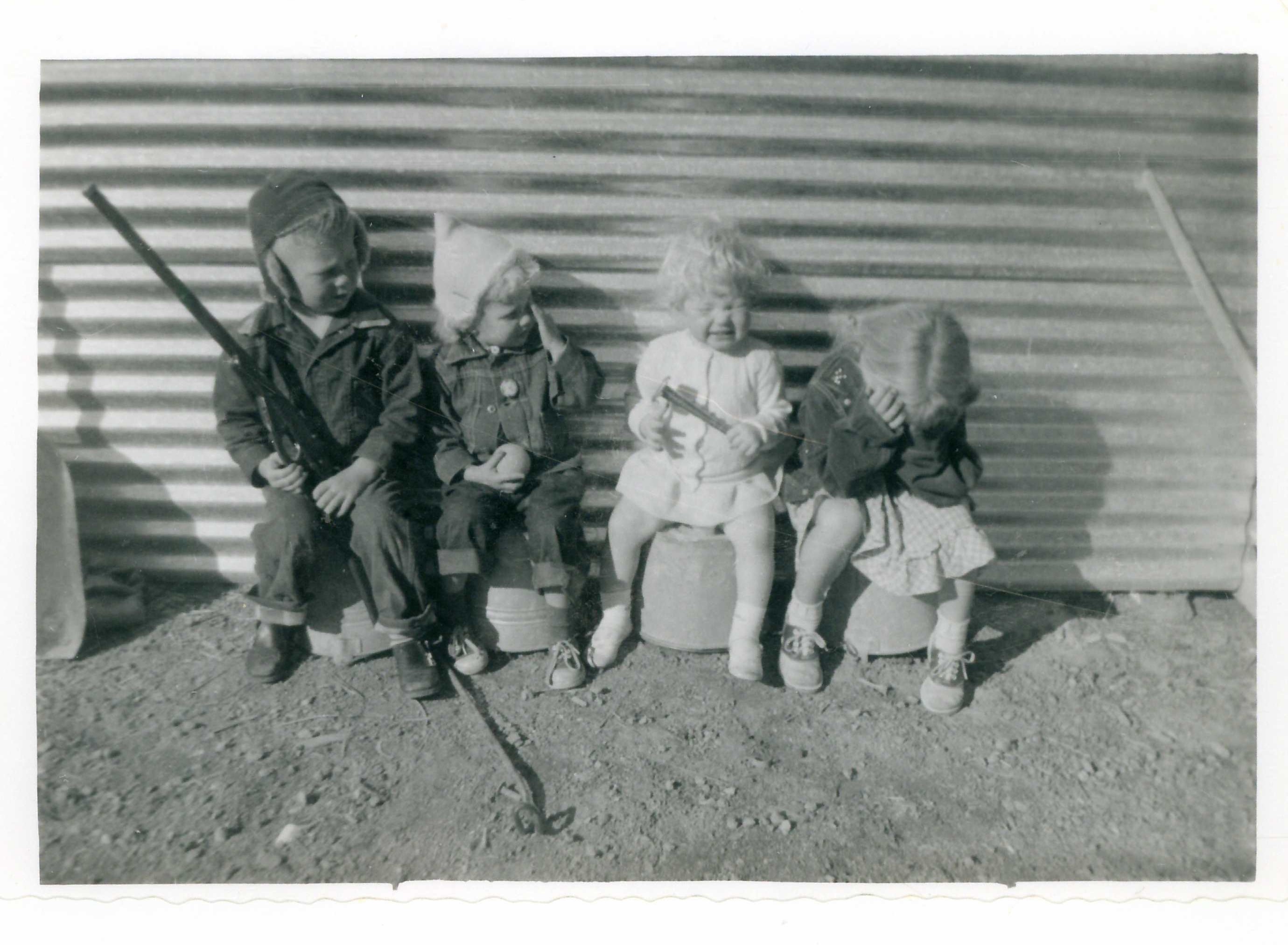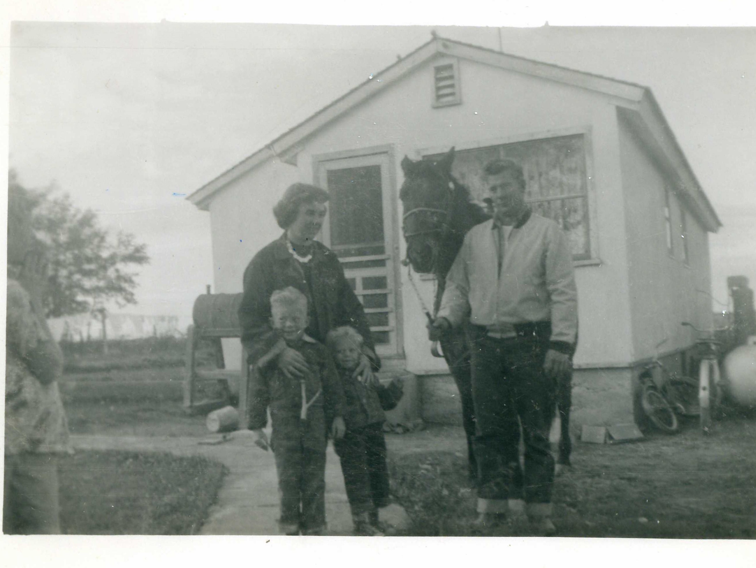 Colleen and Norwood Jonas, with Doug and Sandy in front. This photo is out at Hunt, Jerome, Idaho on the Johnson farm about 1957-58.