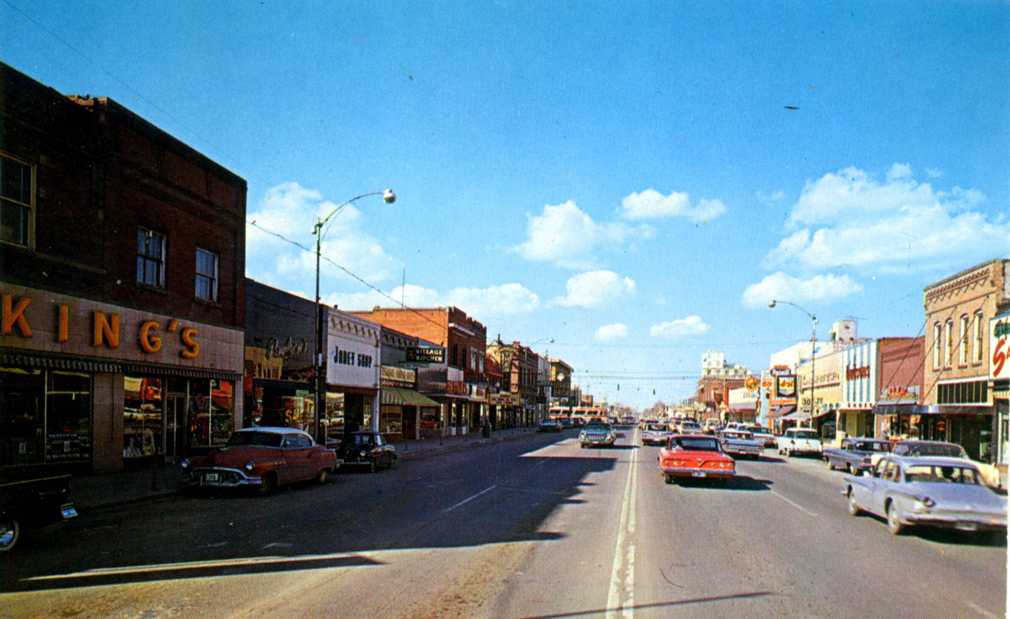 Another one of those classic postcards I picked up of Burley, Idaho. I am guessing this one is dated about 1962. The red car driving away in this picture is a 1961 Chevrolet Impala by the distinct ‘v’ shape in the middle. The car approaching on the left is unfortunately a 1961 Chrysler. It is also very distinctive in its styling and you can see it has fins, which Chrysler dropped in 1962. The white car parked down by Harris Theater looks like it only has two headlights, but upon closer look, you can see the stacked headlights, but I can’t tell the model.