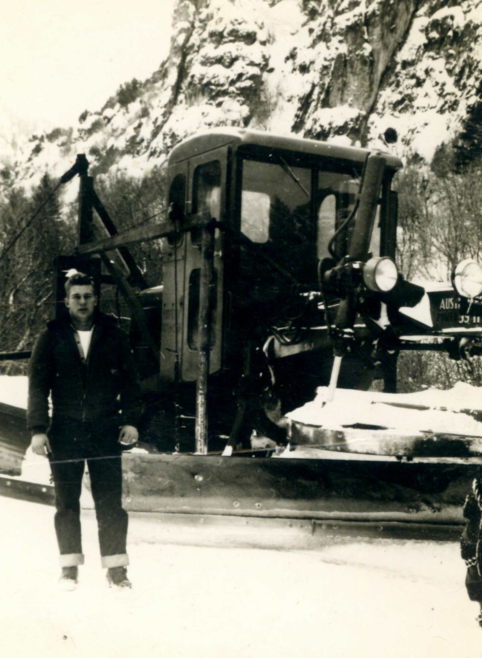 What is written on the back of this photo is about all I have for detail. Grandpa standing beside a blade, presumably for snow removal. The back of the photo says Norwood, Logan Canyon, Dec 1947. My first thought was the blade/grader/patrol looks new. I don’t know if he was operator, stopped for a shot, maybe got stuck, who knows? It is an interesting photo all the same.