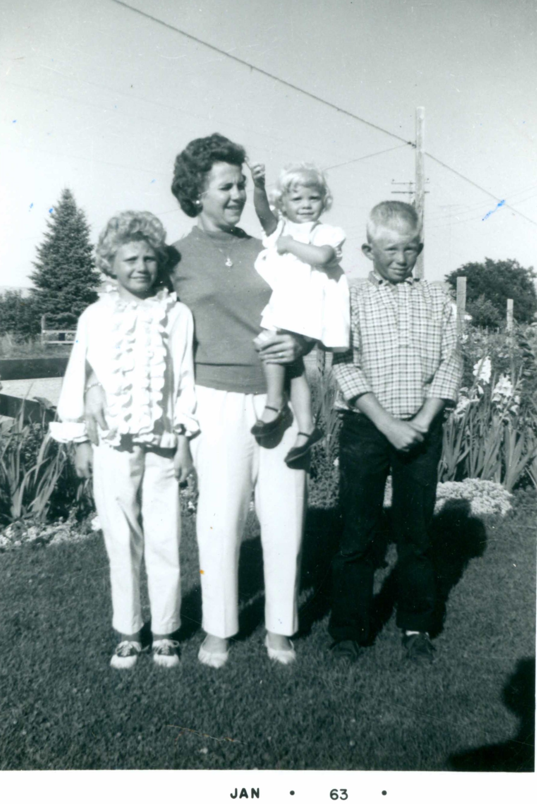 I assume with the lush grass and flowers in the background, this is a photo from summer 1962. It could have been an older roll of film, but 1962 would have turned Doug 10, Sandy 8, and Jackie 2. If it was a more than the summer before January 1963, Jackie would have been less than a year, and she is too old for that in the photo.