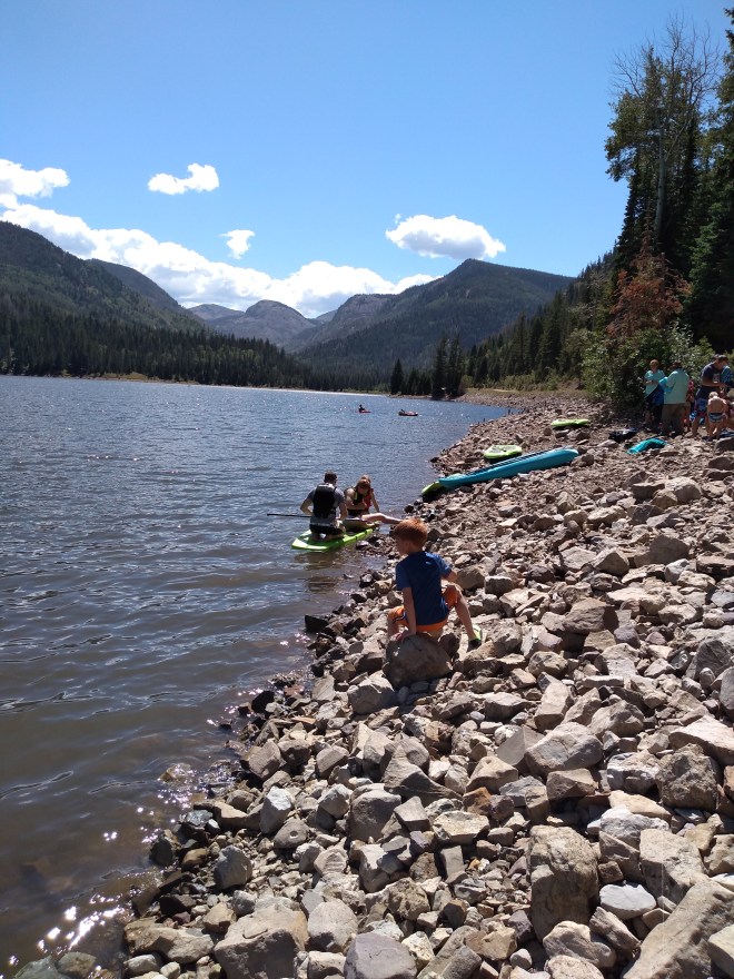 Hiram Ross sitting on the shore of Smith and Morehouse Reservoir with Zach and Alyssa Smart in the background