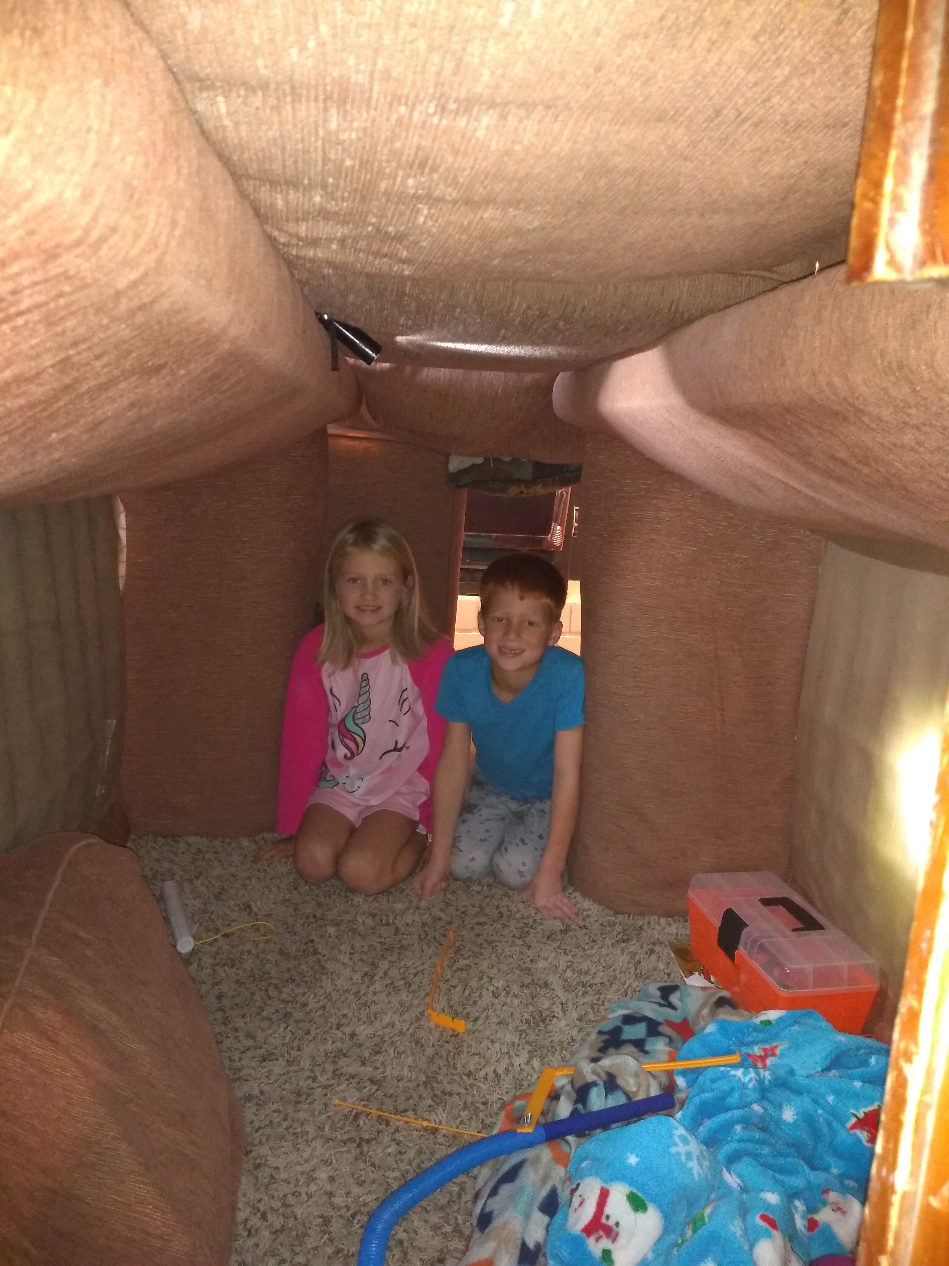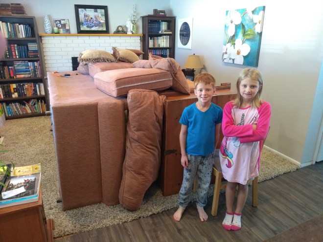 We have a family routine that every Saturday we vacuum all the floors in the house. Once and a while I get a while hair and decided to move furniture and vacuum beneath them as well. I have learned with our new hardwood floors and poorly secured carpets, it is better to just tip the couches into the center of the room than it is to try and scoot, drag, push, or pull them around. Plus it dumps out the couches and also let’s me vacuum the bottom. The kids were goofing off with the pillows and building a fort so I thought I would help them out. Thus, you see the couch fort. I never got something this cool when I was a kid!