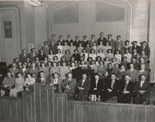 Here is another photo that came from LeReta Jonas Andersen’s family. She stands second row from the back, middle, with the white flower on her lapel. I think I recognize Grant Bagley on the front right, but no clue for any of the others. Anyone have any insight?