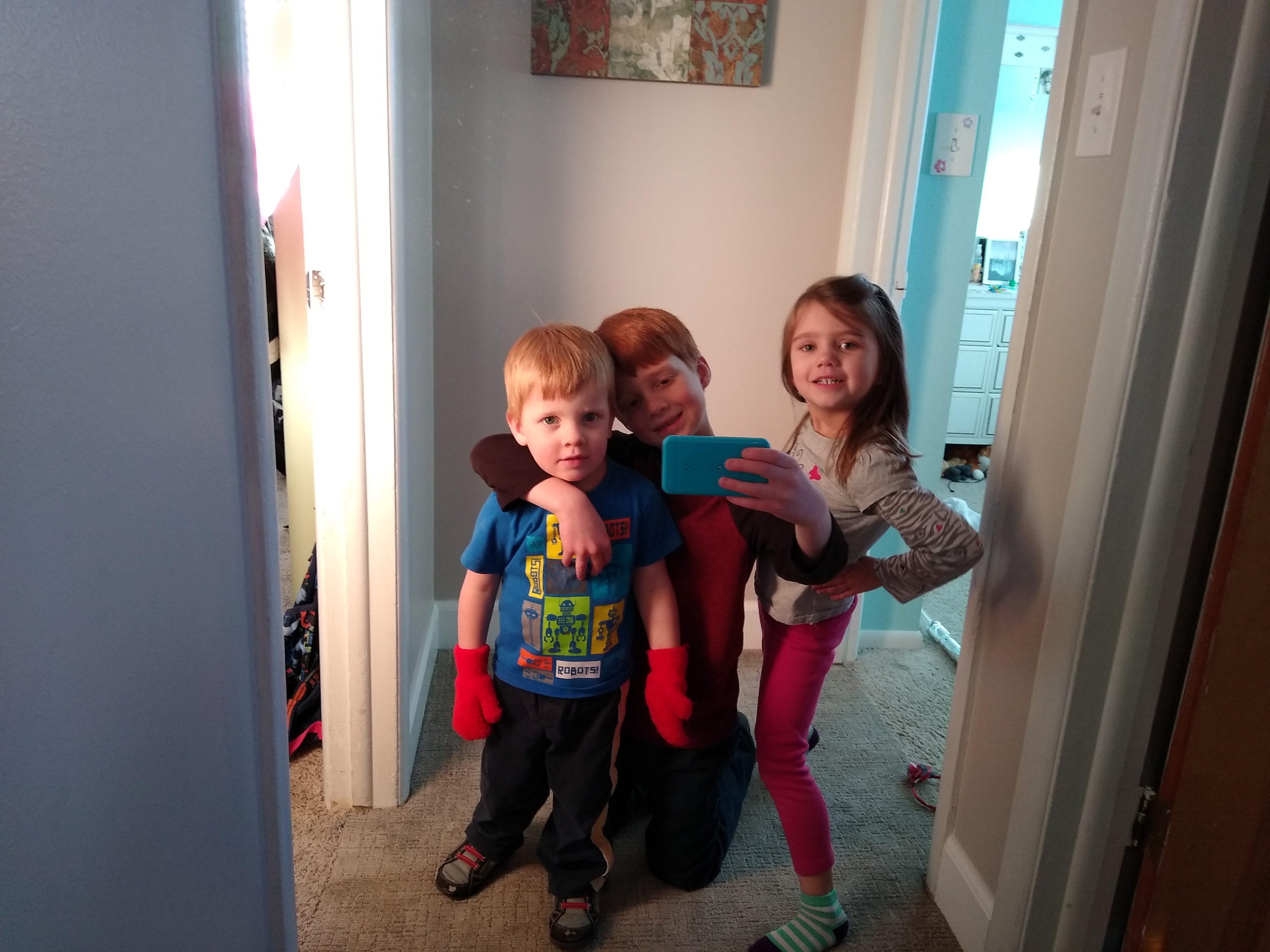 James has been playing with gloves and mittens regularly lately, but also had the little play phone that he was walking around and taking photos. At the end of the hall, he then wanted to take some pictures with Hiram so Hiram happily obliged him. Then they pulled Lillie into it as well. I thought I better capture the picture of them taking a selfie of themselves.