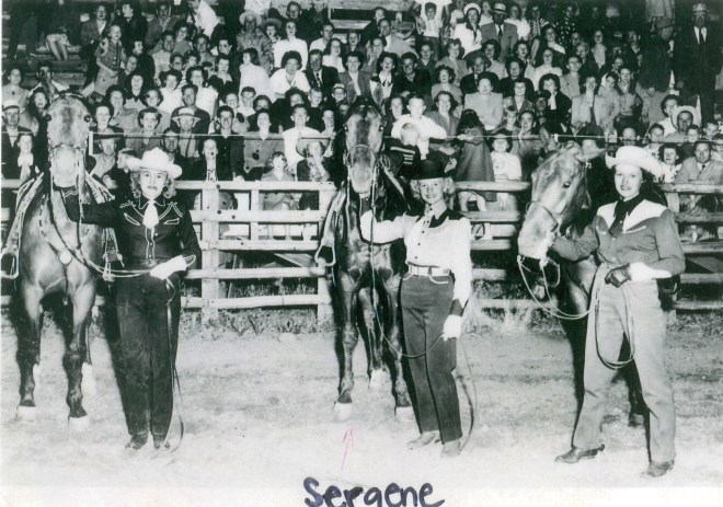 This second picture is of Sergene as the Rodeo Queen and stands in the middle between her 1st and 2nd Runner Up.  The horse was owned by Mr. Peterson who lived on the corner of 1200 East and Oneida in Preston.  Sergene ran on a whim and won.  I do not know which year, I assume this is at Preston.