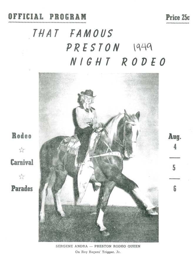 The first is the front of the 1949 program for “That Famous Preston Night Rodeo.”  The photo has Aunt Sergene along with Roy Rogers’ Trigger Jr.  There is quite a bit of history on the That Famous Preston Night Rodeo, but there is much more history available on the internet of Roy Rogers and Trigger Jr.