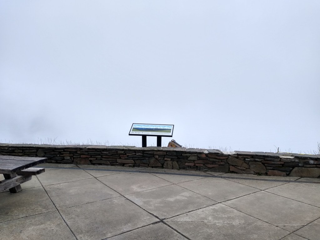 As you can see, we made it to Hurricane Ridge. The interpretive sign points out 17 different peaks all viewable from the overlook. You can also see two rivers and a glacier. Except we couldn’t. We just saw a wall of clouds and had to use our imaginations.
