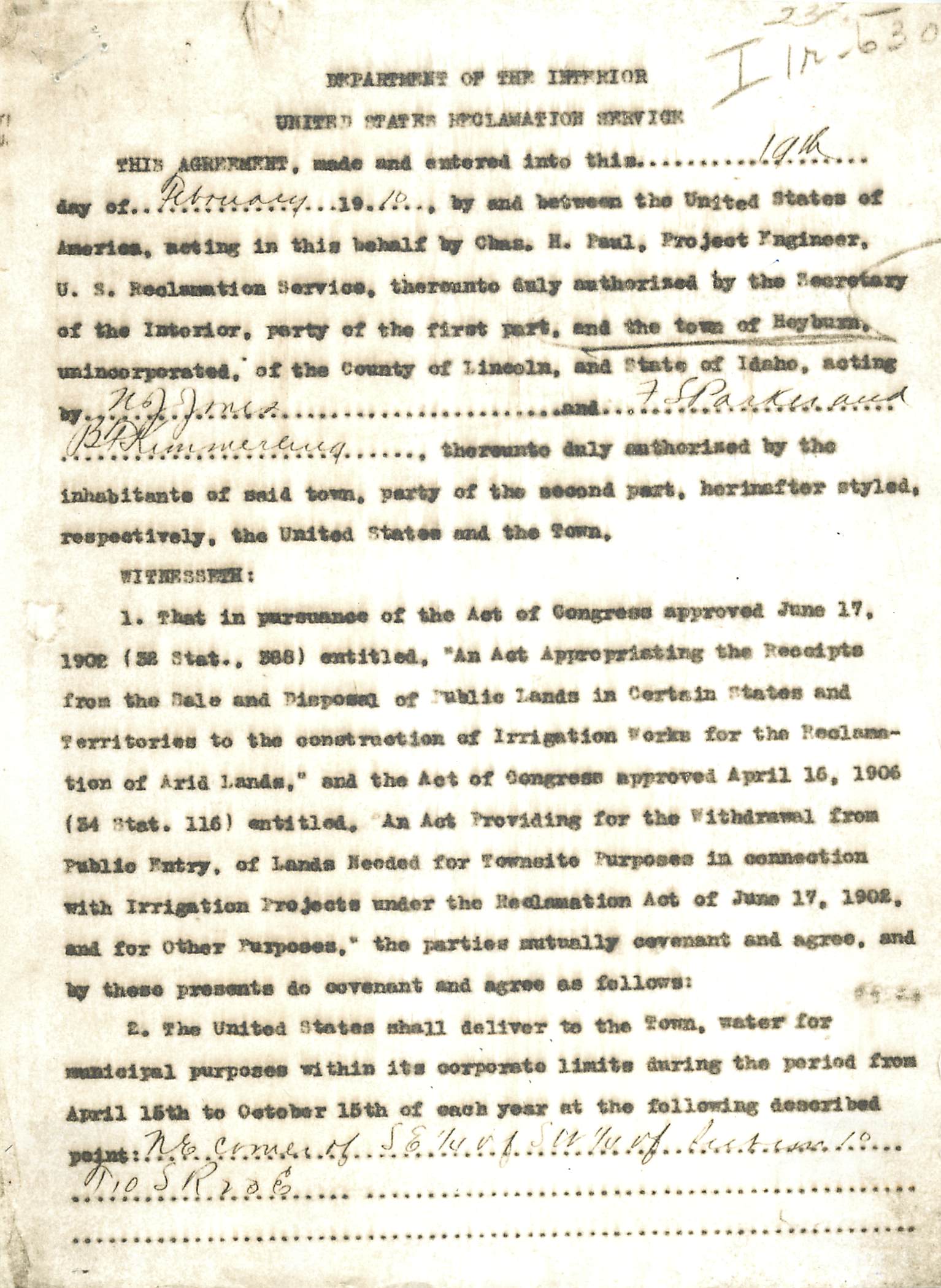 As an interesting bit of history, I thought I would share this Bureau of Reclamation contract with Heyburn from 1910.