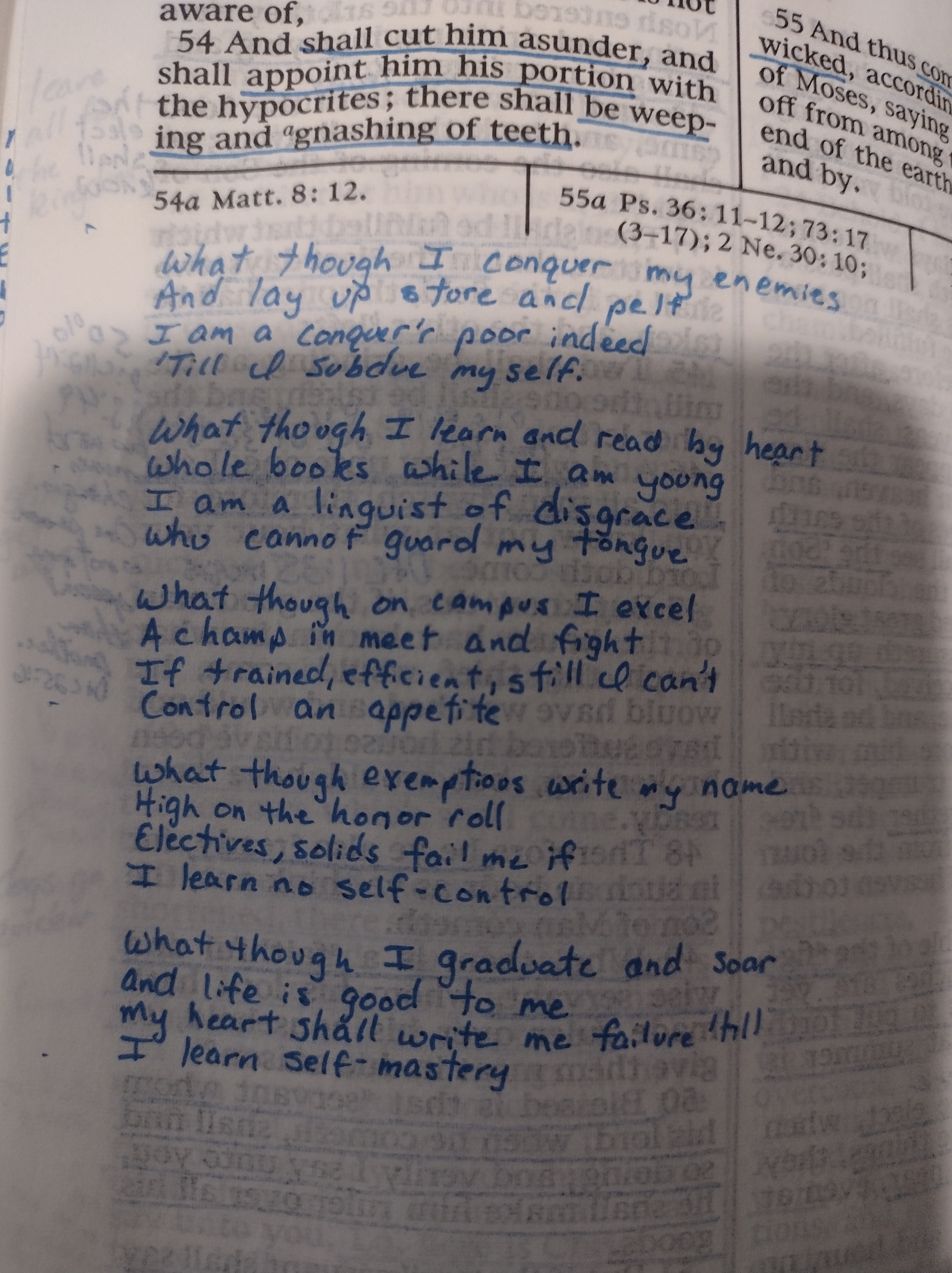 I was writing a talk a few weeks ago and while working through my scriptures I stumbled upon this poem I remember writing in there while on my mission in early 2000. I want to say it was while I was in Runcorn, England, but I cannot say for sure. It struck me as relevant now as it was then. Just to be clear, I did not write or compose this poem. I tried to locate a copy online and found the first paragraph, but none of the rest. It says it is author unknown (for at least the first paragraph). I did find that David O. McKay cited the first paragraph in a talk in 1967.