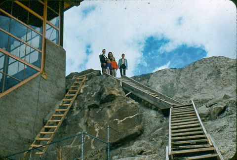 I had these two photos shared with me many years ago of my Grandparents, Milo and Gladys Ross, at Dinosaur National Park. The Quarry Exhibit Building opened in June that year to the public. You can see the building to the left in the picture. The construction stairs and ladders are still in place and were removed that year. I would expect those were removed for the opening to the public, so this might predate the June opening.