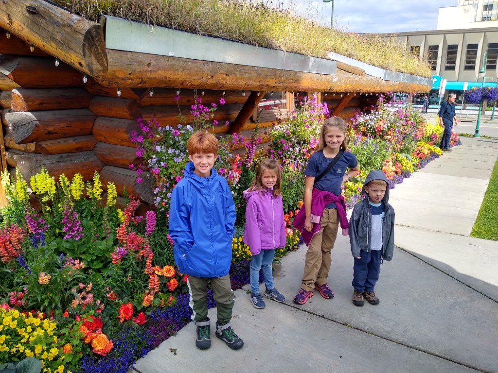 The visitor center stands out in downtown Anchorage as a log cabin reminder of its past. The amazing part was the flowers. Alaska has long daylight hours with mild temperatures. Due to that, the flowers grow large and pretty. You can definitely see that in these flowers.
