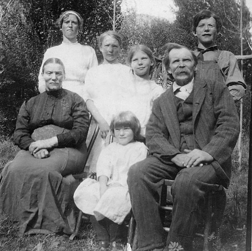“Annie Petersen was born at Lindberg Denmark on October 9, 1862. Her father was Hans Petersen and her mother was Kjirstin Jeppesen. They were a poor family as her father was a tenant farmer. Most of his time was spent working for a landlord to pay rent for a small piece of ground that he would call home. They lived in a small thatched roof house and as is recalled there were but two rooms. The landlords brother having come to America at a previous time had been sent to Denmark on a mission from Utah. The landlord was very bitter against the Mormons and forbid his brother to even come on his land but being a very sincere man with no fear the man held meetings at several places. One night he was at Annies fathers home in spite of all the mob warnings to her father. After the people came her brother Chris stood at the door with ax in hand to keep intruders out; at another time while the missionaries were at their home some of the non members climbed on the house and stuffed old rags in the stove pipe and smoked them out. Annie was the oldest of four girls and one boy Christian. When she was about fifteen years old she joined the Morman Church. At that time men of Zion were sending money to women and girls for them to come to America. She was sixteen at the time. As none of her family was able to come at the time, her parents gave her a gallon of butter and a feather pillow and she came alone. It was a rather rough and stormy all the way across the sea. Many were seasick and some died. The day she could see land a big storm came up and blew the ship back to sea and it was a week before she could land. Later her mother, brother and sisters were converted and came to America. Her father later came to America and joined his family. Brother Chris is the father of Mark E. Petersen who is now an Apostle. The family came to Mesa Arizona because that is where the missionary lived and no one was at the station to meet them so since they could speak no English they stayed in the station overnight. They were met in the morning. It took the family 3 years to earn enough to get to Salt Lake where all but Annie settled. Upon her arrival previous to theirs she had been met by Mr. Staley in Kanab, Utah and then went to St. George, Utah where they were married. By covered wagon they went to Old Mexico where she was to live in pologamy with the first family of Mr. Staley. He had children as old as she was at the time and she lived in an adobe house. The first Mrs. Staley was good to her in her way but the life of a pioneer isn’t too easy and she didn’t know the language very well. When she had four children Chester, William, Vermina, and Dicey Ann her husband died and left her 5 months pregnant with her fifth child Maryett (Marie). She gleaned fields, washed, worked in a store and was given the siftings of sugar that were in the bottom of the sacks. She did almost anything to keep the little ones fed. After Maryetta or Marie was born it really was a struggle. The boys helped what they could. With the first money that Chester earned he bought an oil lamp and a small white kettle for her. About 1896 she met Jorgen Jorgensen. He had two teenage sones. His wife had been dead for sometime. They were married and at the time they only place they could find to live was an old cow shed. They worked hard cleaning it up and fixing it to be liveable. She cooked over a campfire. They were later able to find an adobe house which seemed like a mansion. Her husband Jorgen was a miller by trade but because there was no mill there he farmed. While living in Mixico there ware five children born to them. Annie, Ephraim, Pernellie (nell), Emma and Clara. In 1911 there was a mixican uprising and all white people were driven out of the country. One of Jorgens sons had stayed in Arizona and when the uprising came the other stayed behind in Mexico. Minnie had married a Moroni Feen and they had stayed in Arizona. Dicey was married to William Chestnut and they came to the United States with their parents. Before leaving they made a lot of soft soap and made their own yeast cakes of hops and cornmeal dried in the sun. They had two wagons and a load of children. Hyrum Jorgensen and wife stayed in Airzona also. It was a long tireing trip. They stopped on Sundays to rest and when they came to water they stopped to wash and bake bread. Near Moab, Utah one of the mares foaled and they had to wait two weeks before the colt could travel. They settled in Ferron Utah and then moved to Blue Valley to farm. It was a beautiful place; very lush and fertile, but the dirty devil or Fremont river ran threw it and befor long lived up to its name and becuase of the floods in the river they couldn’t keep their dams in the river so they couldn’t keep water on their farms. The last few years they lived there they hauled water in barrels on a sled behind a horse to water their garden. Before long the Blue Valley settlers had to leave their homes and settle elsewhere. Annie and Jorgen moved to Fruita, Wayne Co. Utah in 1914 and had a Fruit Farm. Eph was getting old enough to help so he peddled the fruit during the summers and the smaller children picked fruit and had other jobs. Thus their children grew up. Annie married Floyd Pendelton, Pernellie, George Dewey Gifford: Emma, Archie Bird; Clair, Lamar Nielsen; Eph May Lerwill.