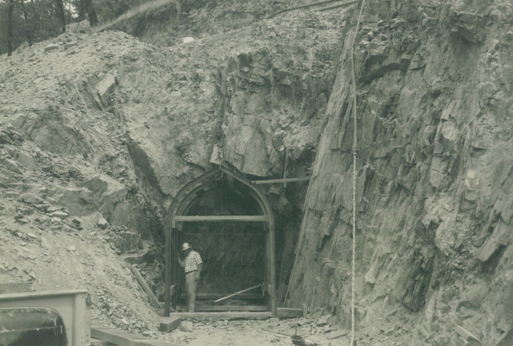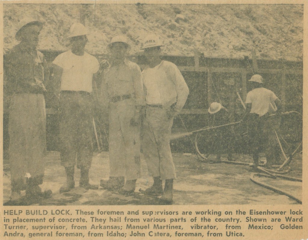 “HELP BUILD LOCK. These foremen and supervisors are working on the Eisenhower lock in placement of concrete. They hail from various parts of the country. Shown are Ward Turner, supervisor, from Arkansas; Manuel Martinez, vibrator, from Mexico; Golden Andra, general foreman, from Idaho; John Catera, foreman, from Utica.