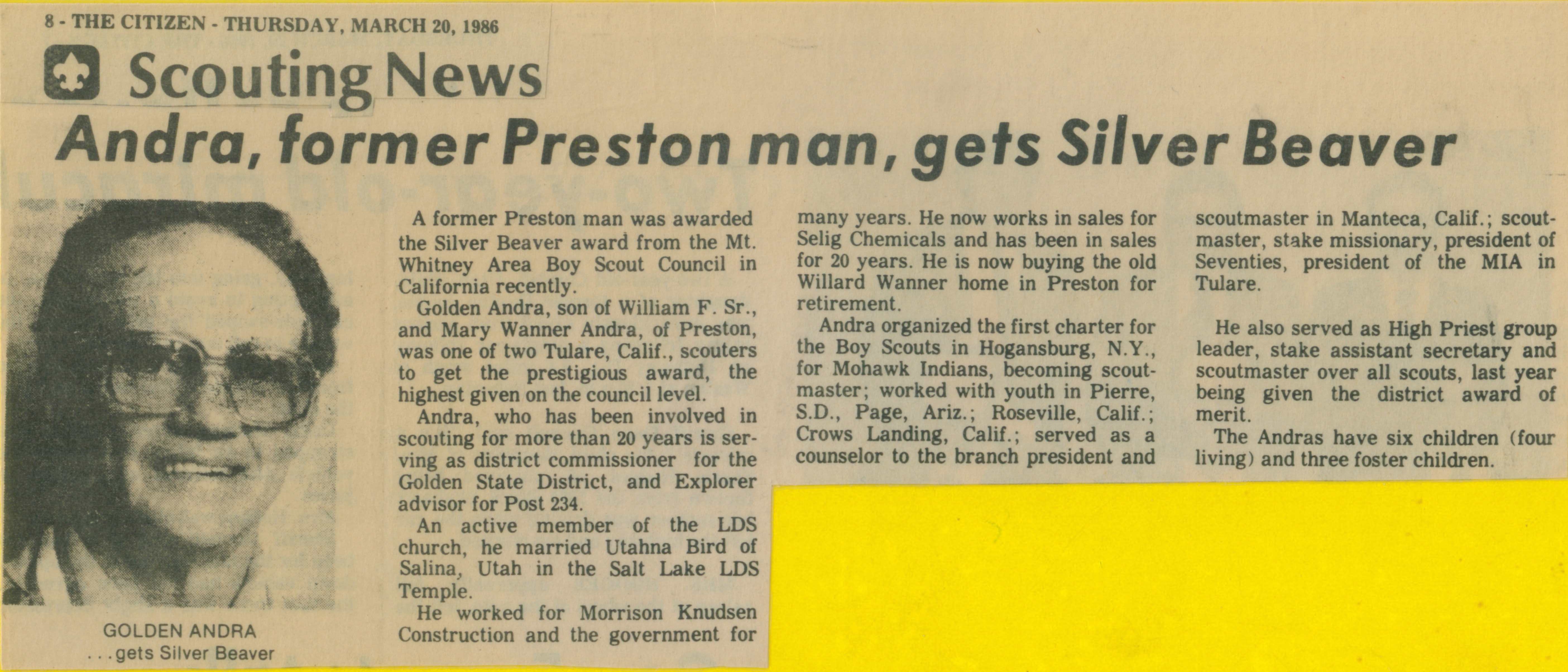 “Andra, former Preston man, gets Silver Beaver. The Citizen (Preston, Idaho) 20 March 1986.