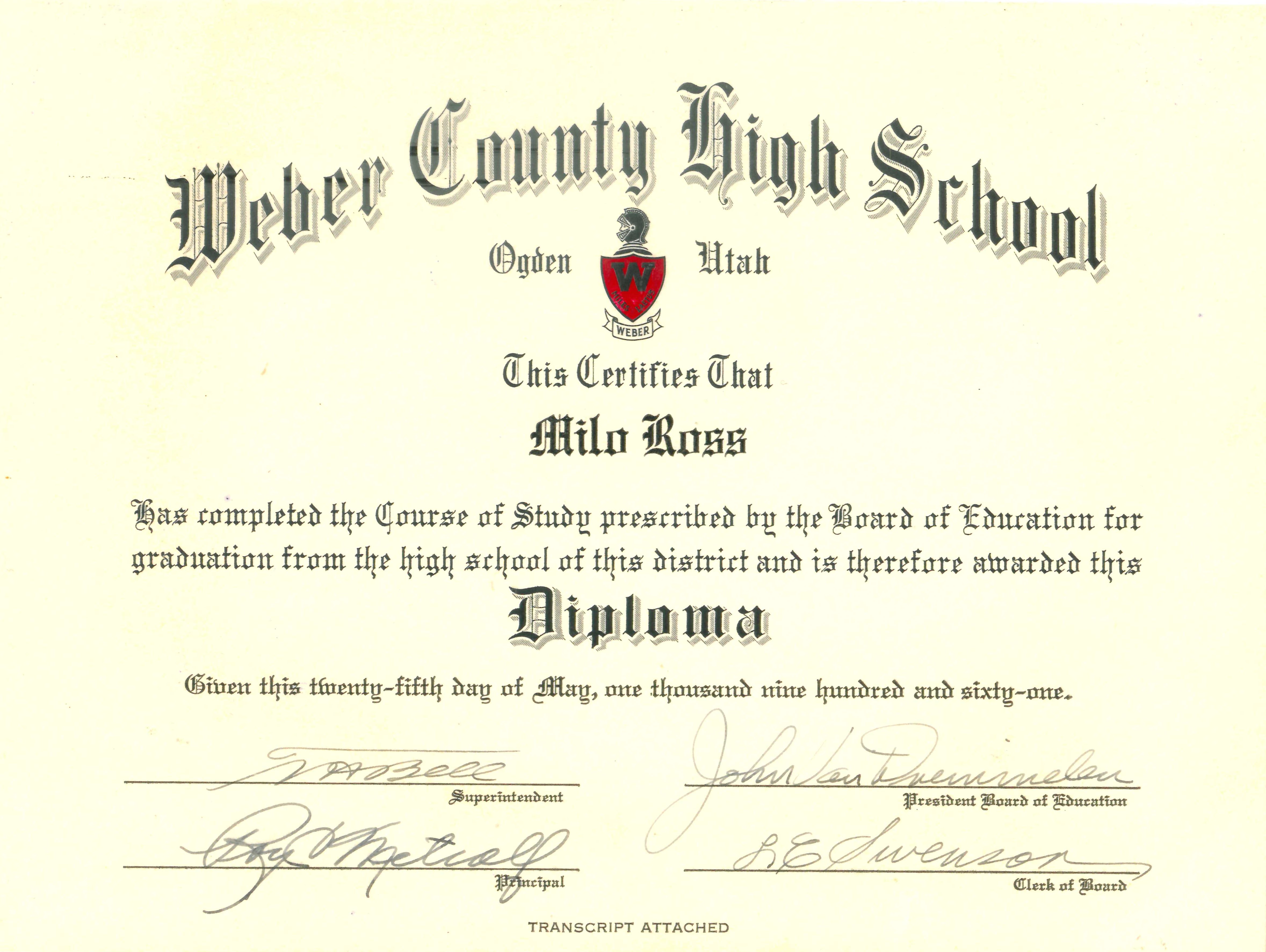 Milo Ross Diploma from Weber County High School in Ogden, Utah