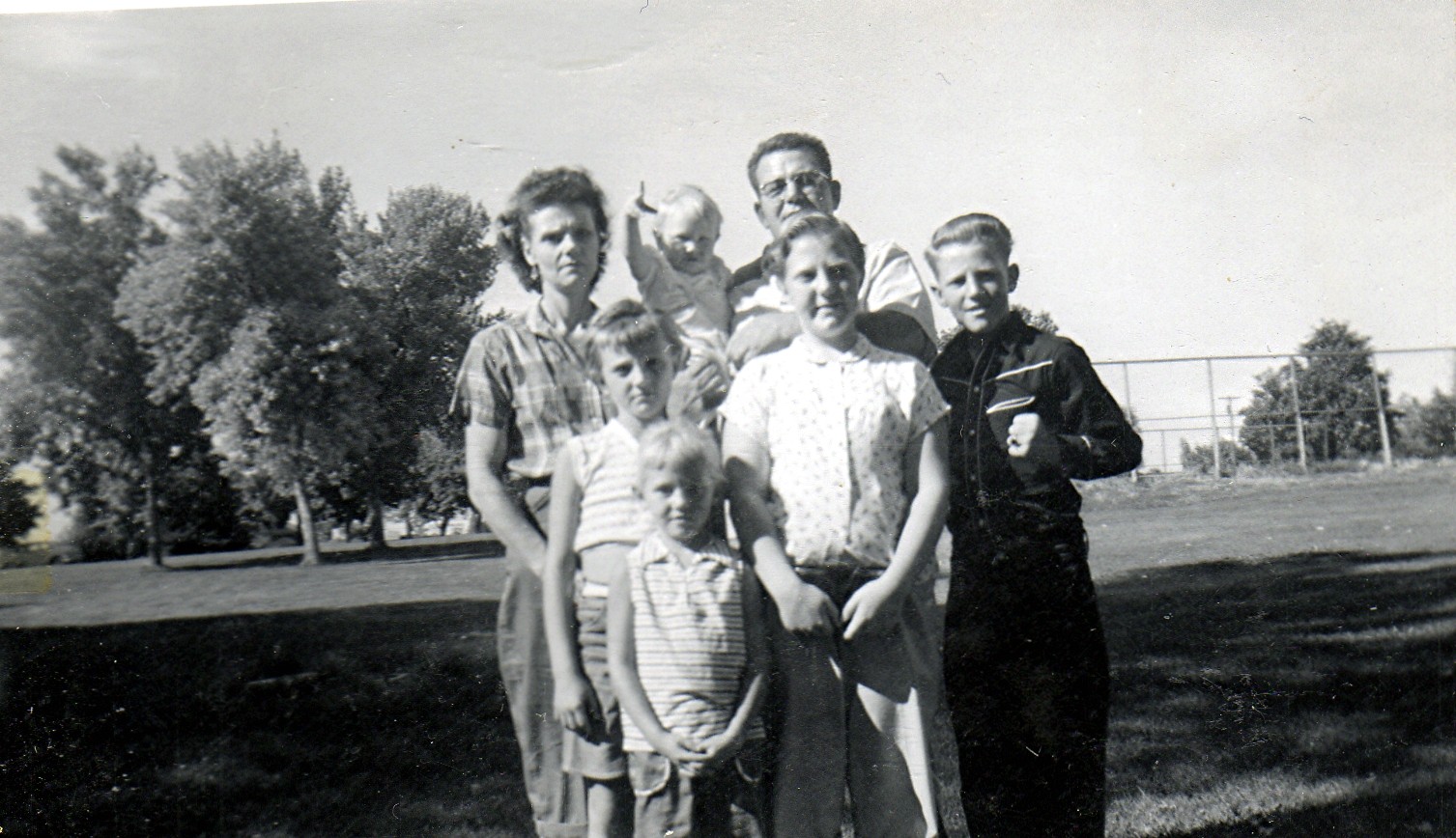 Ellis Jonas (on the ground), children (l-r): Paul Jonas, Julie Jonas (sitting on Ellis), Janeal Jonas, Sherlean Talbot, MaryLou Jonas.