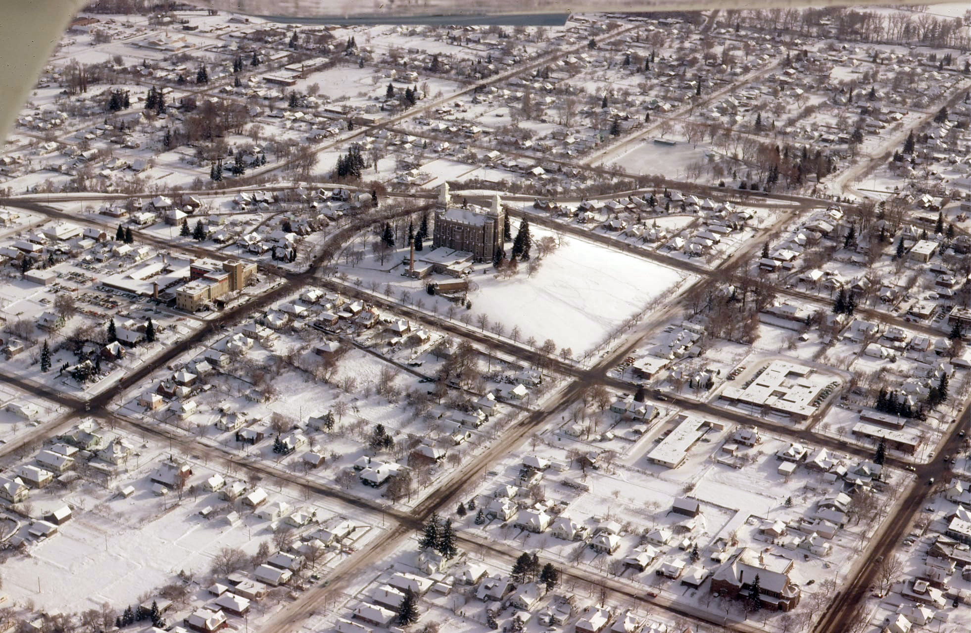 The aerial photo above with the hospital and temple appear to be before the late 1970’s renovation of the temple that replaced the annex and placed the parking down the hill on the temple grounds (it doesn’t look like it even had parking on the temple grounds). The hospital is in full use, so before the construction of the new hospital in 1980.