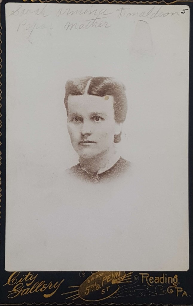 Then there is this third photo. This one had written on the front, “Sarah Armina Donaldson, Papa’s mother.” The interesting part is the photo paper is of a photographer in Reading, Pennsylvania. So this must be a photograph of a photograph, and looking at it that does seem to be the case.