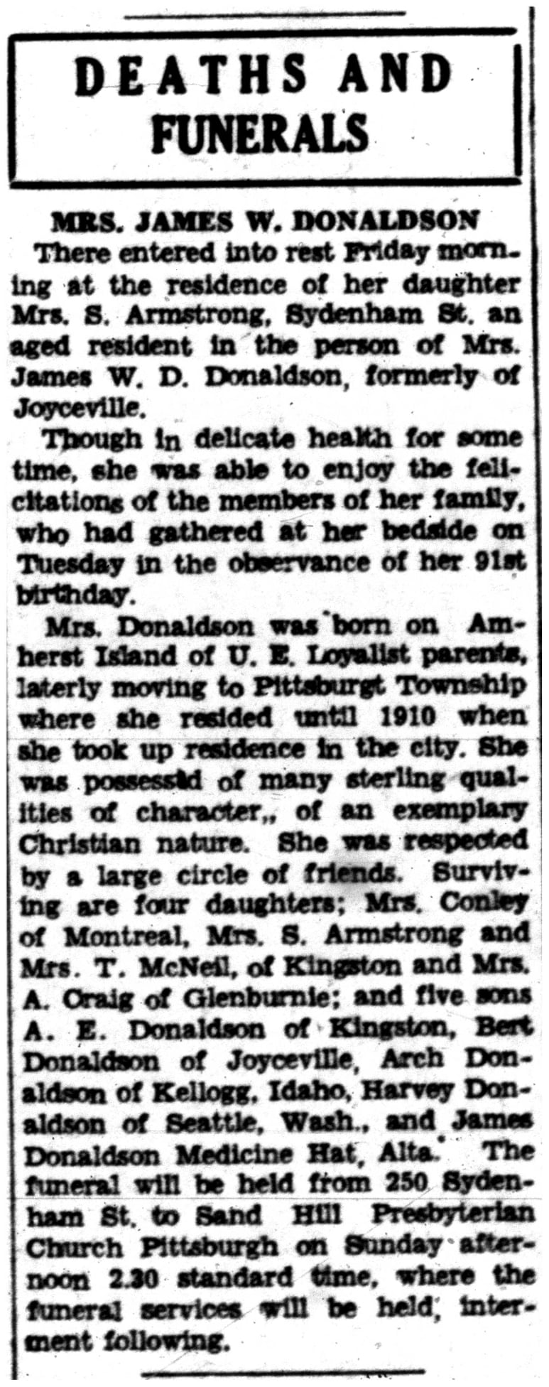 This is the family of Nancy Hutton and James Wray Donaldson. James is the brother to my Joseph Russell Donaldson. James was born 20 November 1833 in Northern Ireland. Some list it as Bredie in County Tyrone. But I don’t have any documentation that even confirms that as yet. Same issue for my Joseph. James immigrated to Ontario Province, Canada. He appears for the first time on the 1861 in Pittsburgh, Frontenac, Ontario. It was in Joyceville, Frontenac, Ontario that he married Nancy Hutton. All 13 of his children were born in Pittsburgh or Joyceville. He was a farmer his entire life. It was in Pittsburgh he died 19 October 1907.
