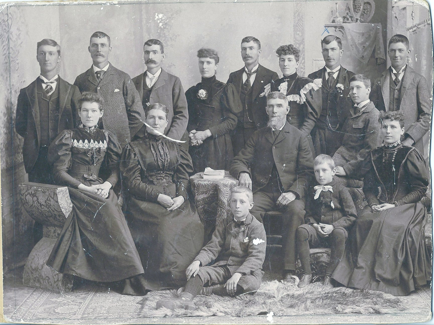 James and Nancy Donaldson family, order of 13 children, unknown for certain which are which in the photo: William Alexander (1861), Mary Elizabeth (1863), James (1864), Sarah Amelia (1864), Thomas Henry (1868), Archibald (1870), Annie Mathilda (1872), Robert Chambers (1874), Catherine Alice (1876), Francis Hutton (1878), Harvey Osborn (1882), Albert Edward (1884), and John Ross (1887)