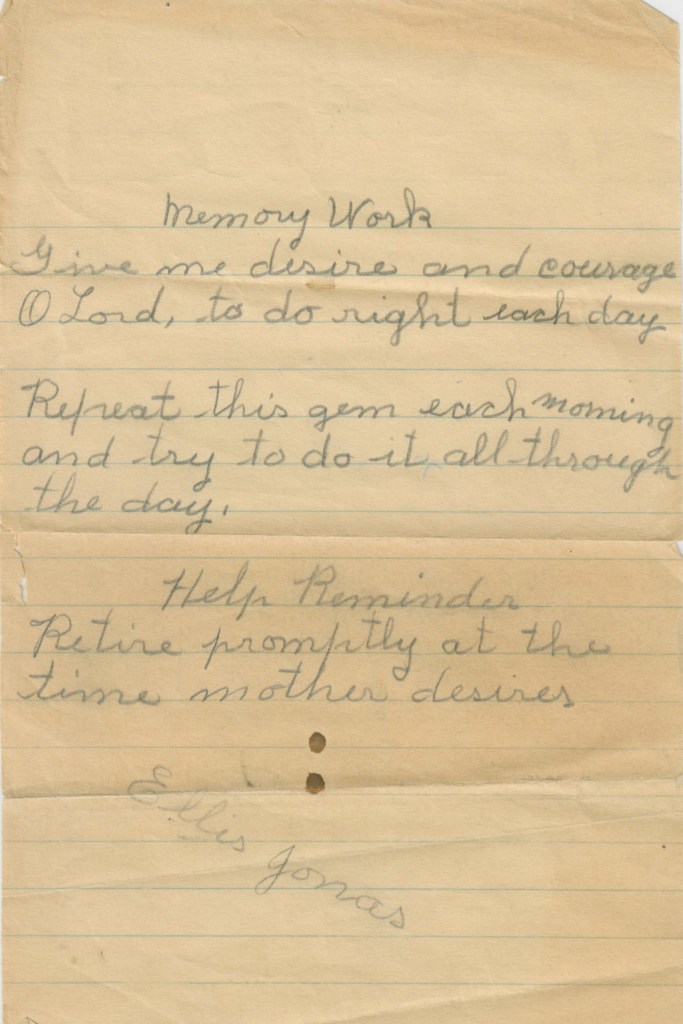 I wrote previously of a book I have that belonged to my Great Grandfather, Joseph Nelson Jonas. The book was given to me by Ellis Jonas along with a couple of others. Inside the book was this note signed by Ellis Jonas. I presume he wrote it, also that my Great Grandmother, Lillian Coley Jonas put it there in the book. Ellis would have turned 98 on 6 September 2024. He was born on my Great Grandparents’ 10th wedding anniversary, and that date would also be the date his father was electrocuted in 1932.