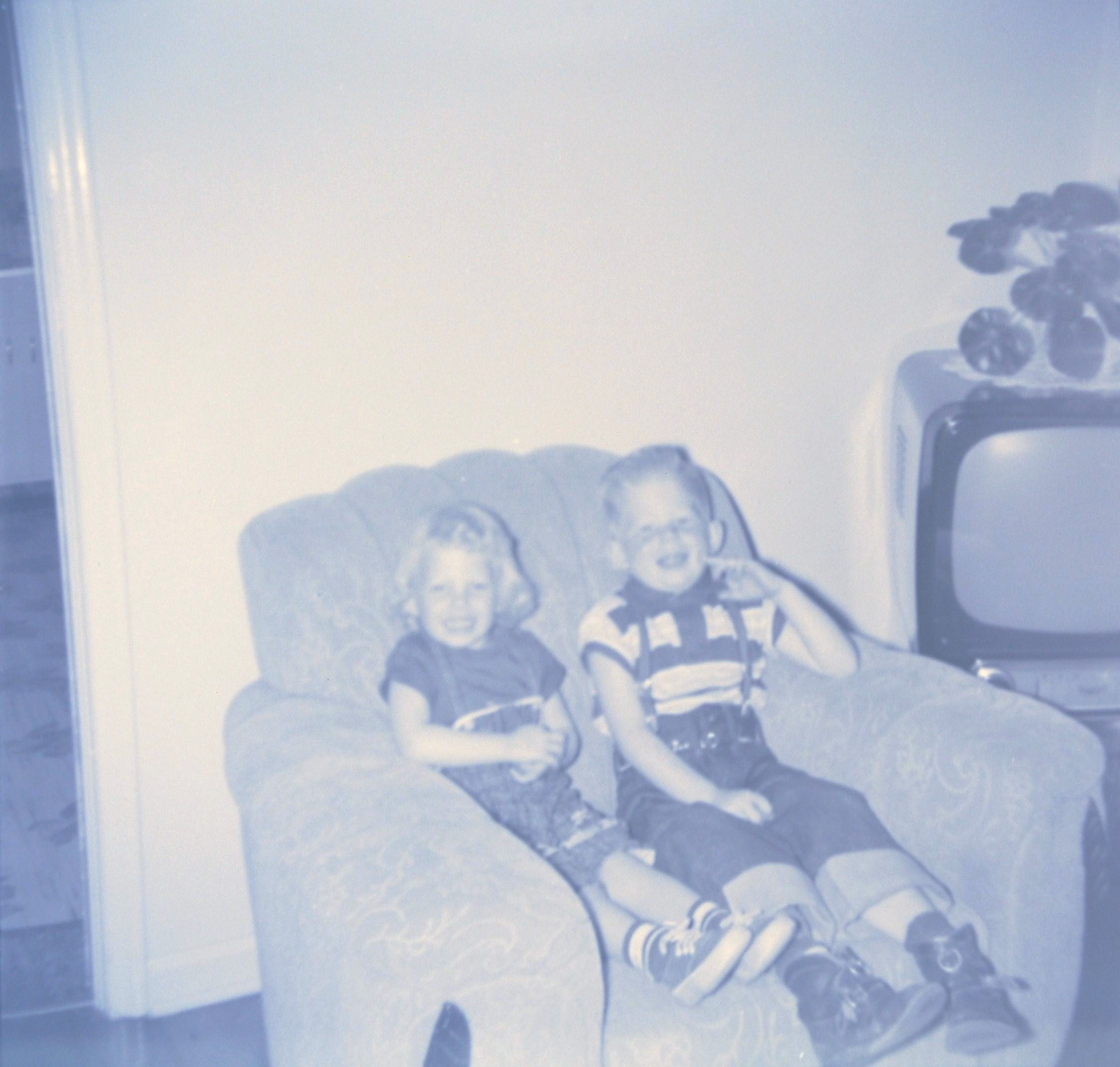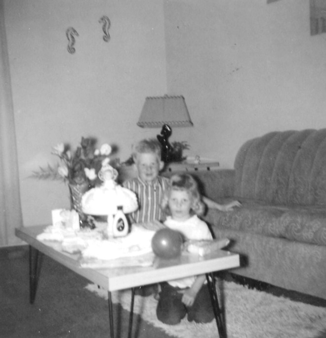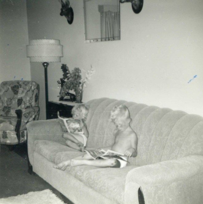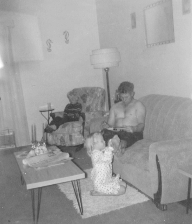 Doug, Sandy kneeling in front of couch about 1962-63