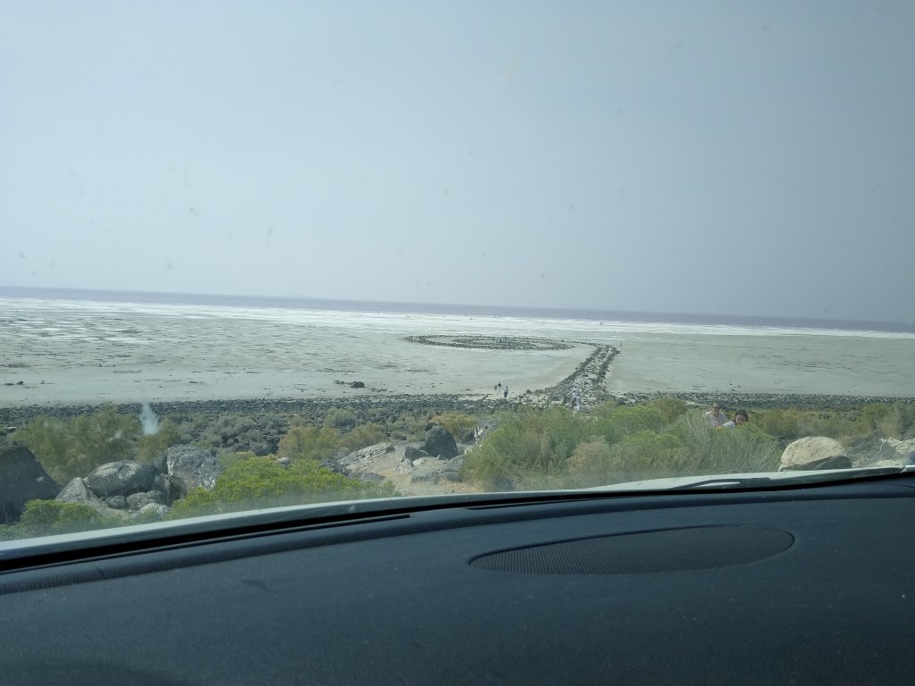 The Spiral Jetty is almost 50 miles from Corinne, Utah. Some of it is pretty rough road and I would certainly not try it in anything but dry and warm conditions. You basically go to the Golden Spike National Historical Site and then go south another 20 miles. There were some limited signs. Take plenty of water. As you can see from the link, we also hit the National Historical Site on the same occasion.