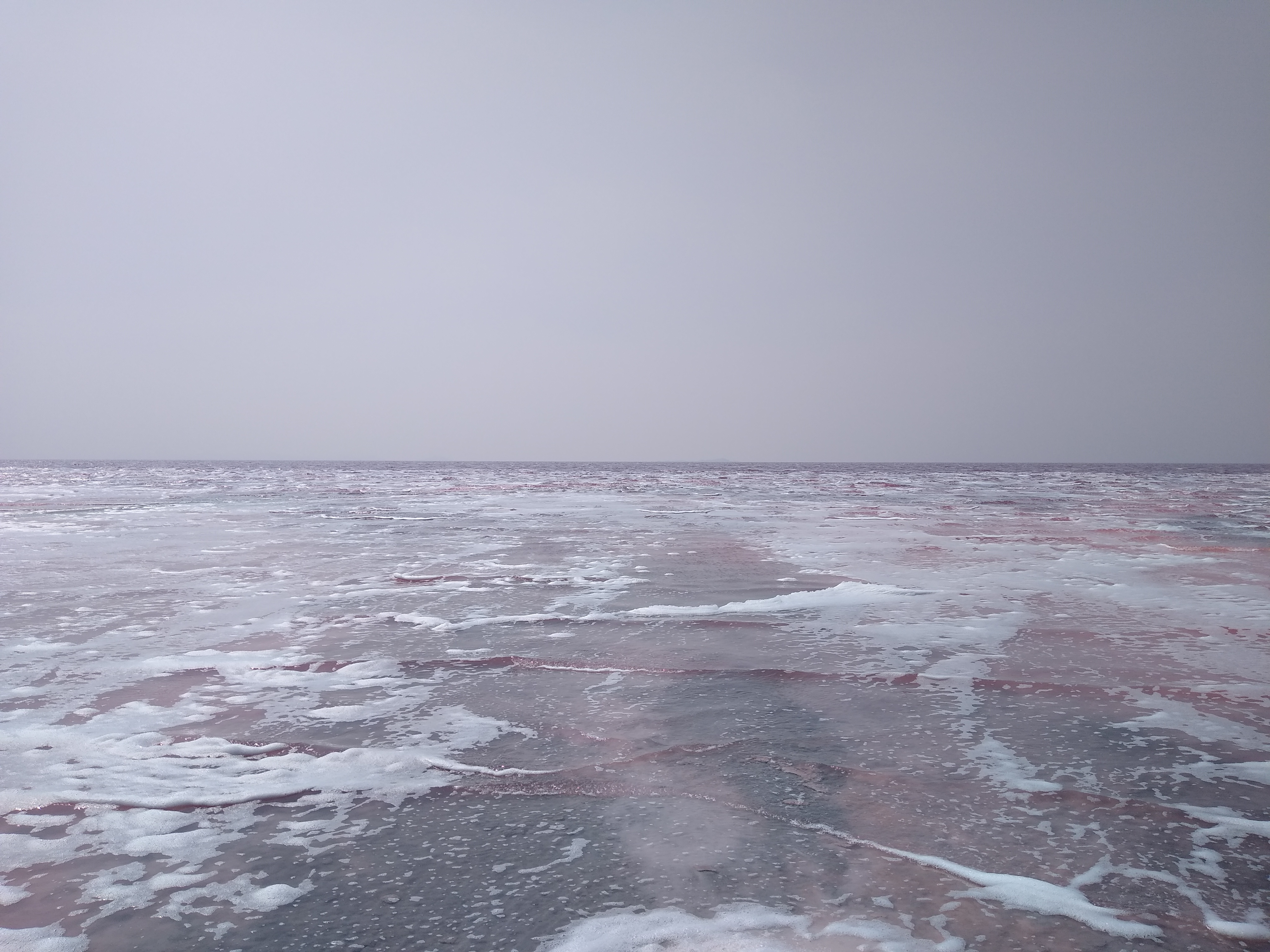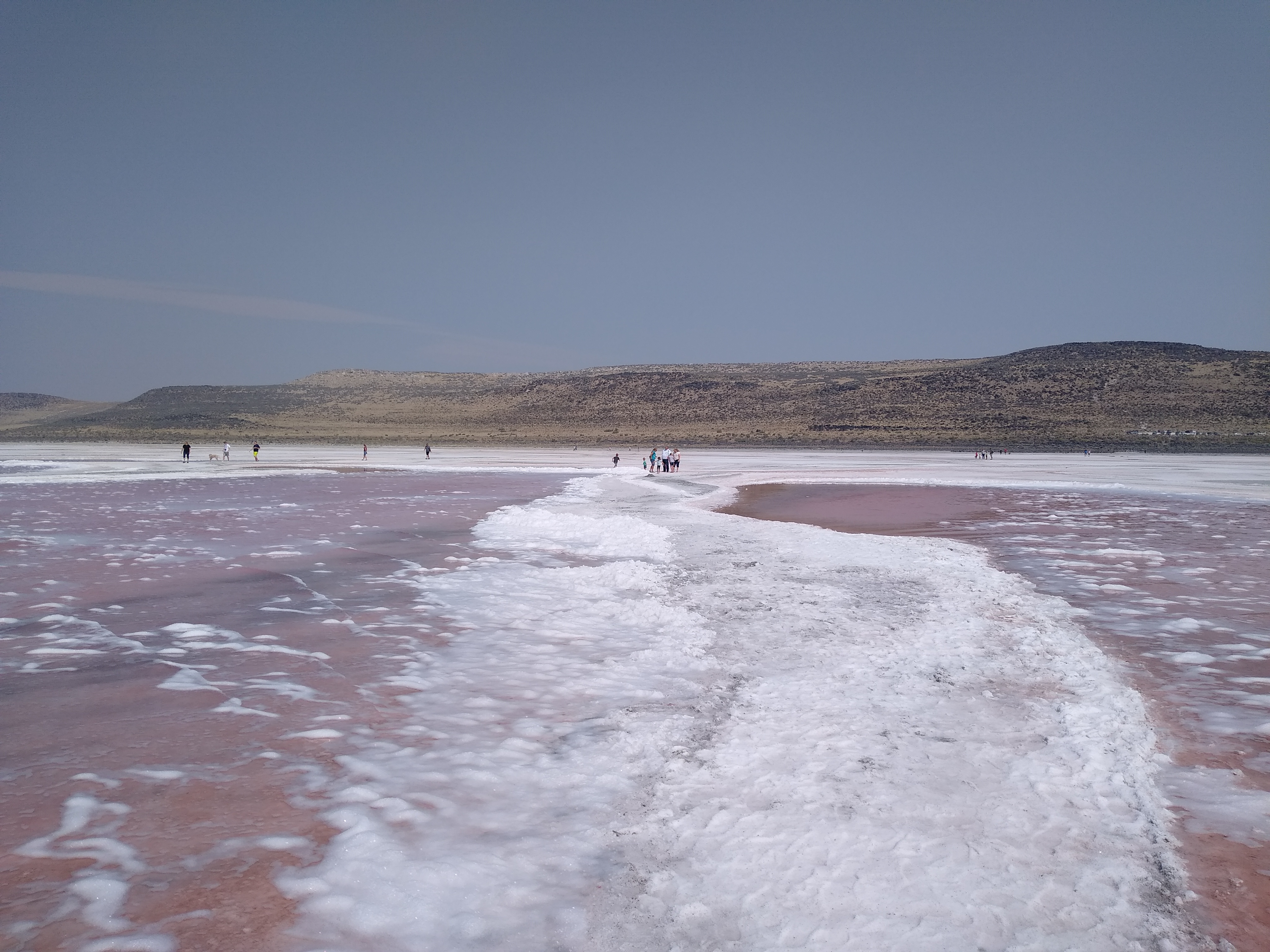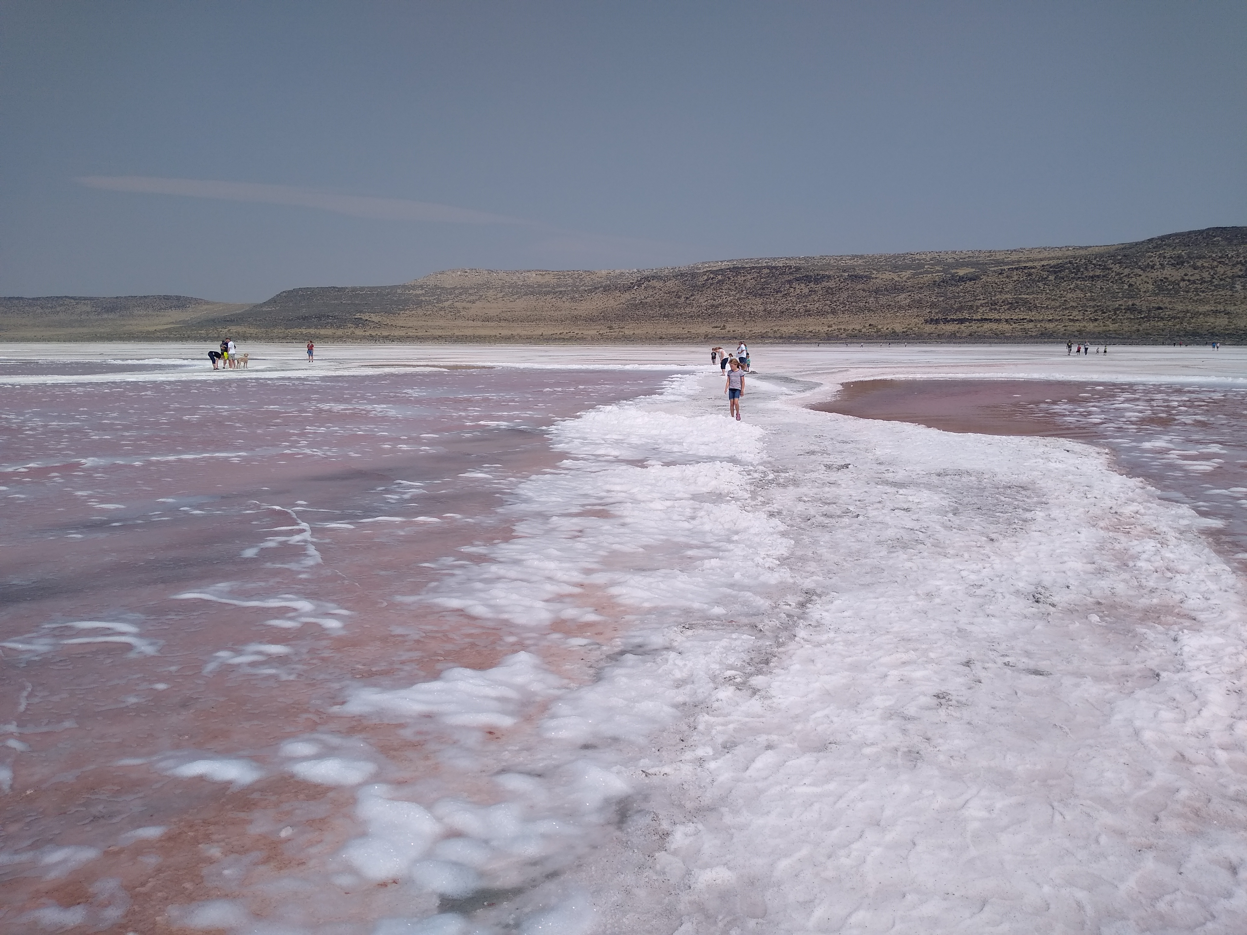 You can see how shallow the water is with the salt bubbles and foam on the water. The sand/soil under has this reddish/pinkish hue due to the bacteria in the water. You can see people walking out on the salt peninsulas. It was a pretty hot and very windy day.