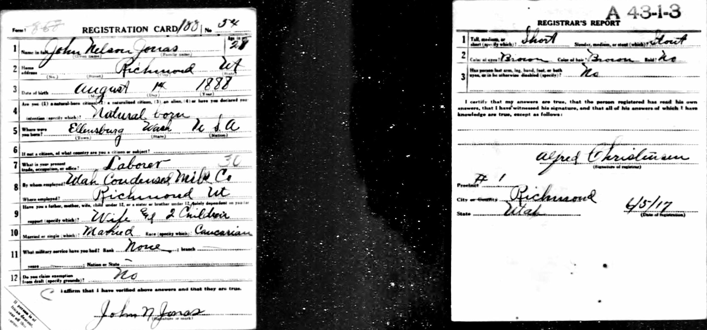 John and Nellie purchased a home 3 April 1917 on the corner of Main and 200 E in Richmond (now 195 E Main).  The entire lot one, block 25 of Richmond City came with the home for $1,200.00.  They moved in when Melvin was only a few days old.  When John registered for the World War I Draft, he indicated he was a laborer at Utah Condensed Milk Company in Richmond.