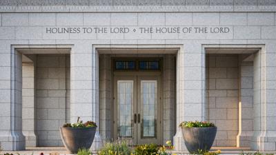An exterior photo of the Burley Idaho Temple. Each temple of The Church of Jesus Christ of Latter-day Saints is inscribed with the words, “Holiness to the Lord • House of the Lord.”