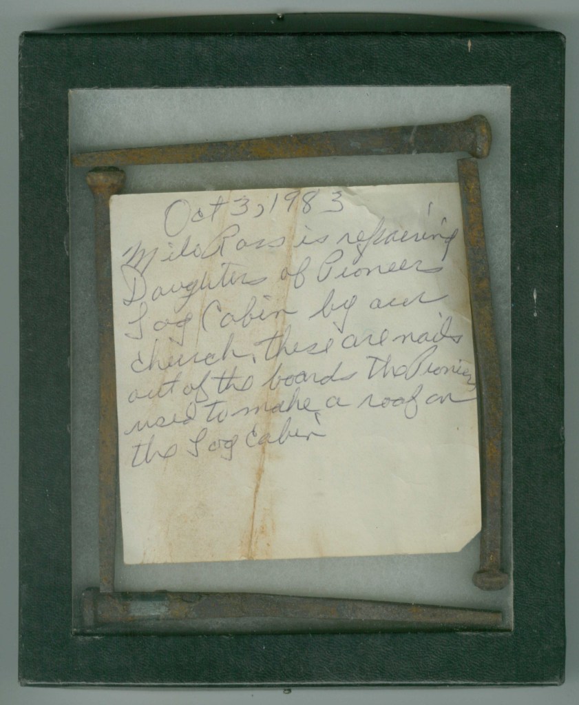 Milo Ross is repairing Daughters of Pioneers Log Cabin by our church. These are nails out of the boards the Pioneers used to make the roof on the Log Cabin.