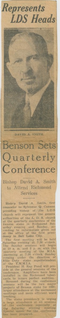 Bishop David A. Smith, first counselor to Sylvester Q. Cannon presiding bishop of the L.D.S. church will represent the general authorities of the L.D.S. church at the quarterly conference of the Benson stake in Richmond Saturday evening and Sunday, according to information given out at the office of the first presidency in Salt Lake City.
