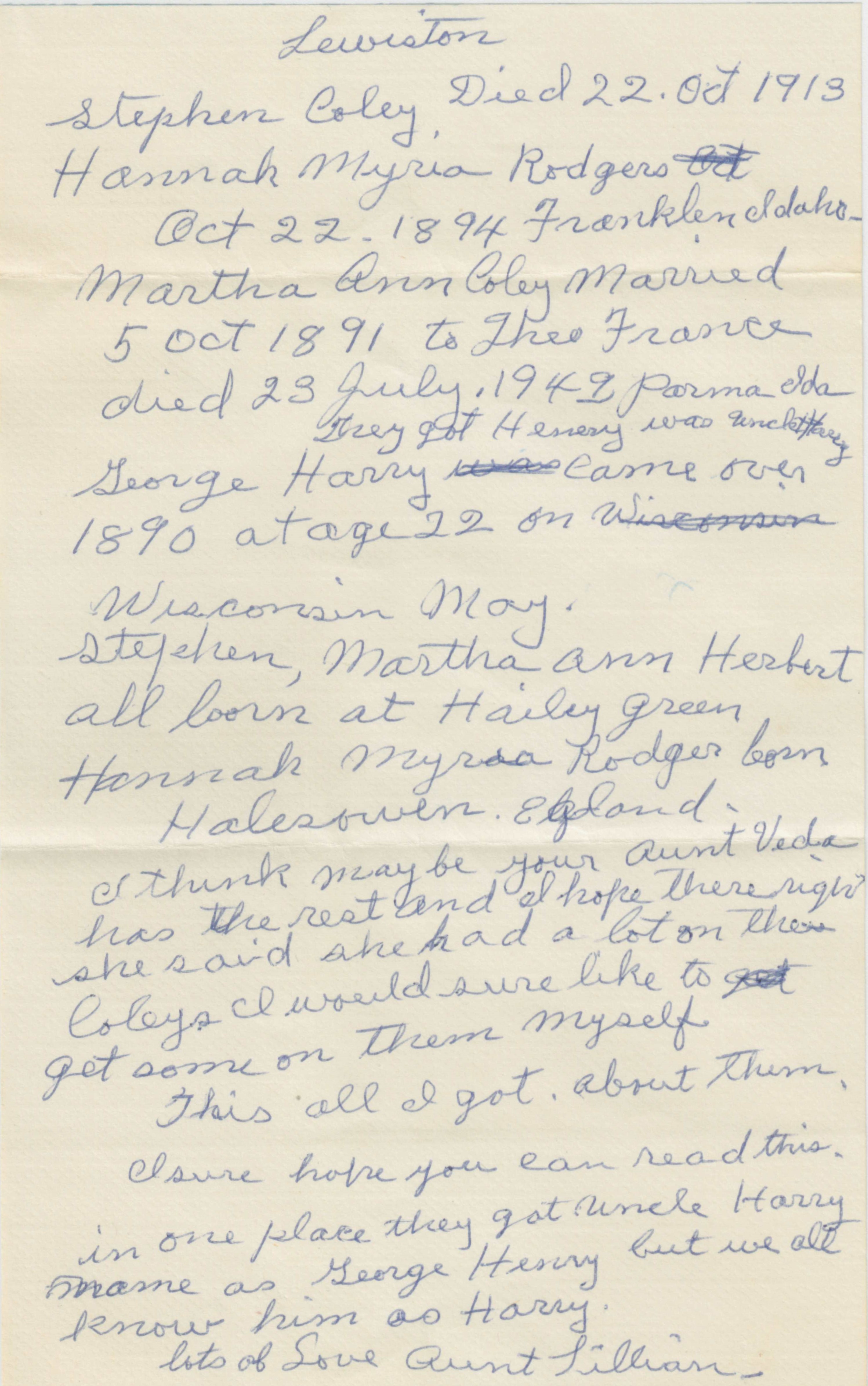 Just haven’t been able to write and tell about the Coleys you see I haven’t been able to get much either. But aunt Veda has a lot she said write her and see if she can help you. I’ll send you what I have about them.