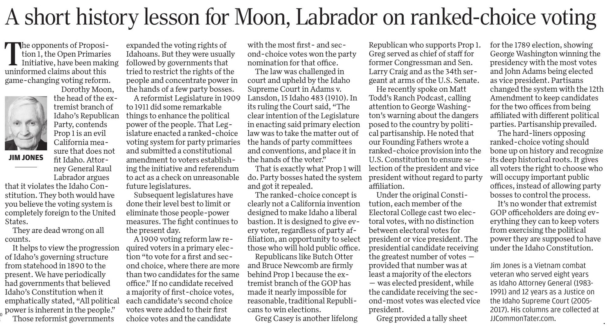 “Best of all, Prop 1 will make it possible for reasonable Republican candidates to make it to the general election ballot. That’s why so many traditional Republicans, like former Governor Butch Otter, are supporting Prop 1. Dorothy Moon and Raul Labrador will no longer be able to defeat civil, problem-solving Republicans in the closed GOP primary. Nor will voters be forced to affiliate, or disavow, any group as a condition of voting in any election financed by their tax money.