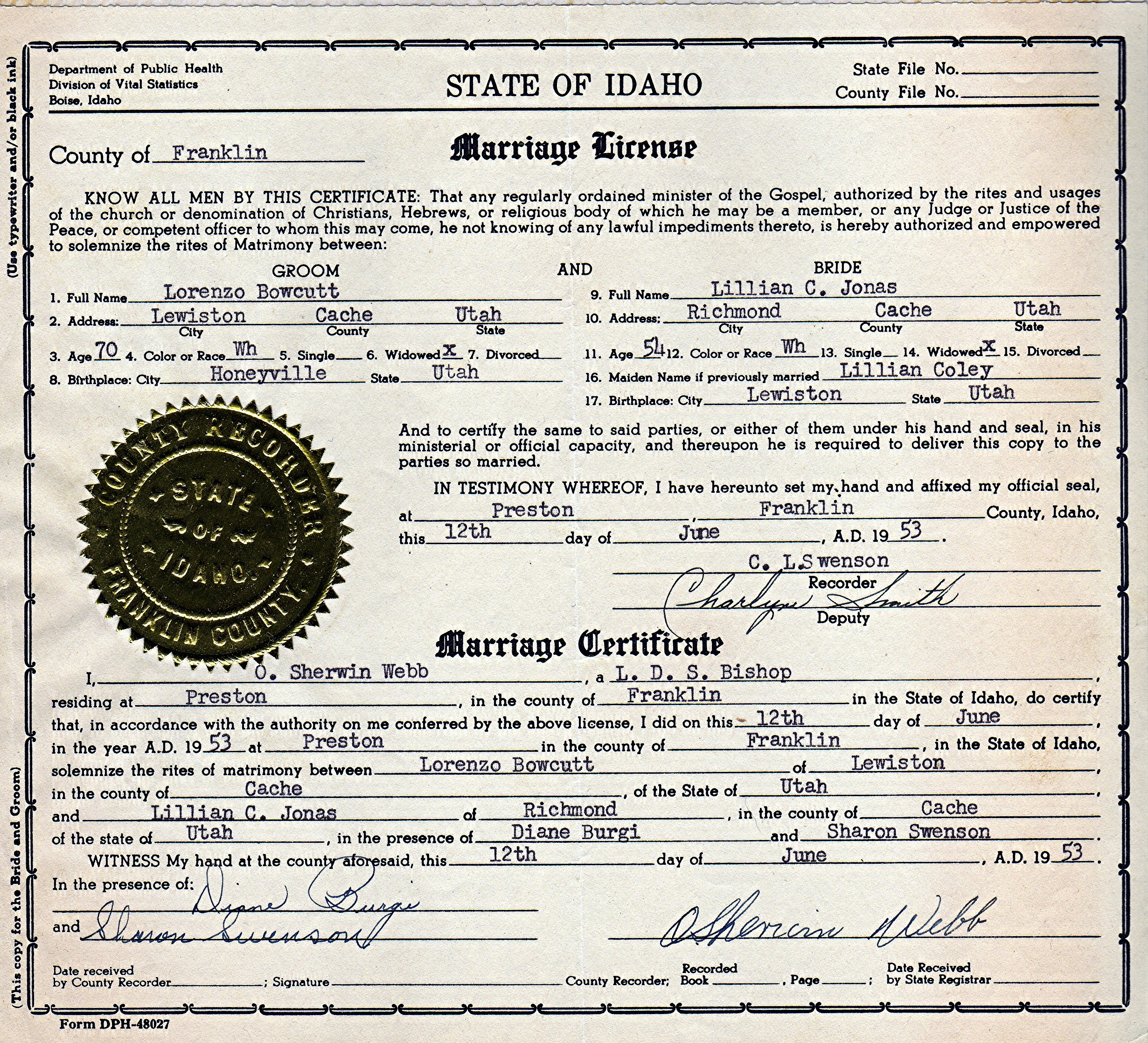 Lillian spent the new few years in an empty home.  She knew Lorenzo “Ren” Bowcutt over the years.  She accepted his offer of marriage and they were married 12 June 1953 in Preston, Franklin, Idaho.