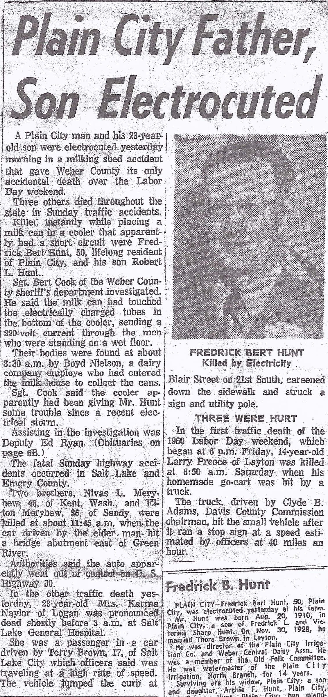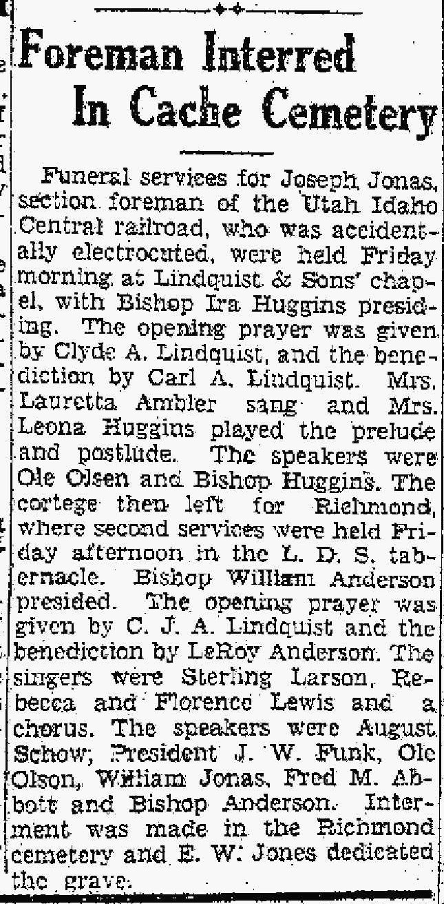 In 1932, Joseph, her husband was electrocuted working for the railroad in Ogden, Utah. His father had worked for the railroad, and most of his family also worked for the railroad. He was made manager and had moved to Ogden from Richmond only a year or two before.