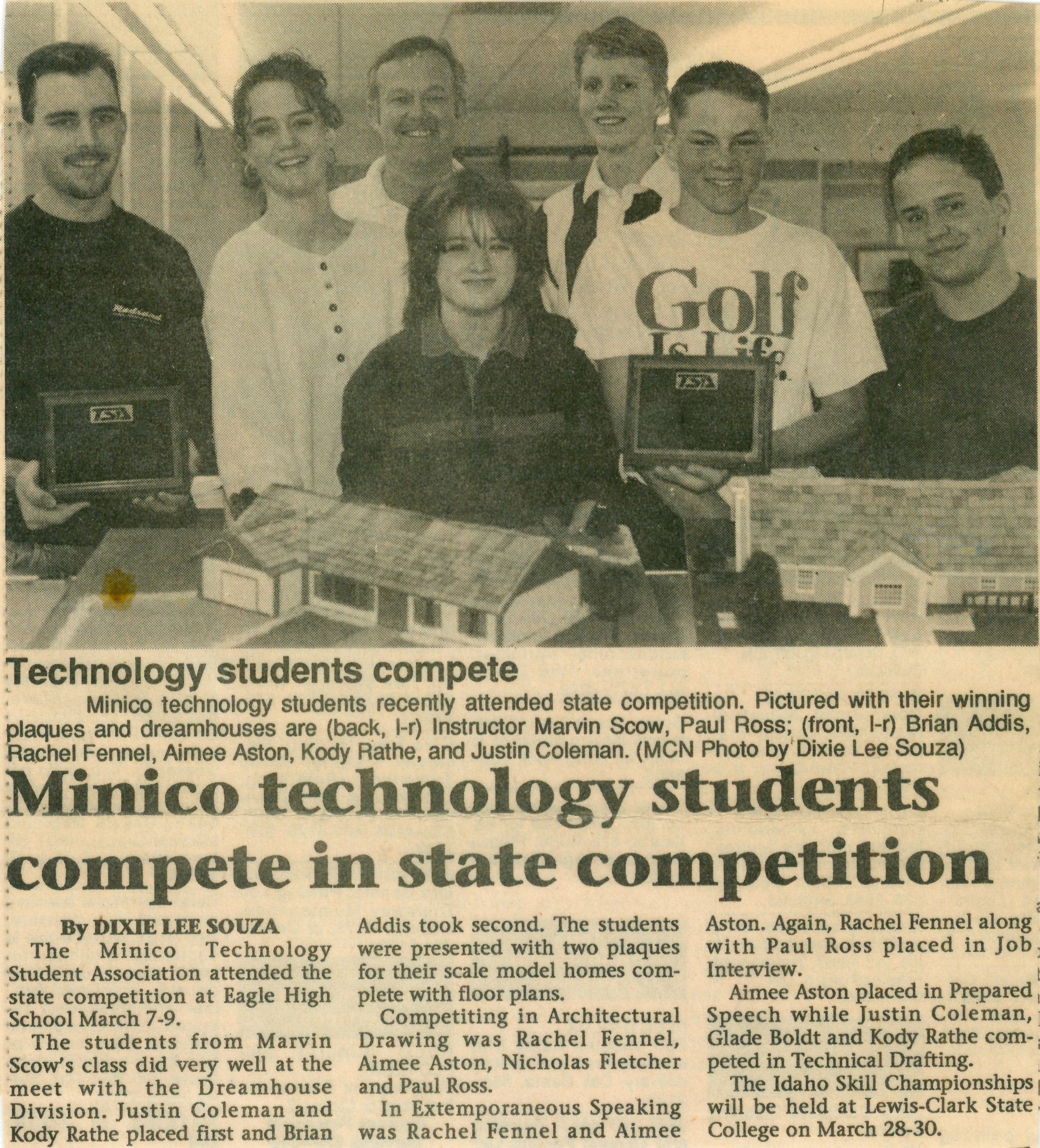 Minico technology students recently attended state competition. Pictured with their winning plaques and dreamhouses are (back, l-r) Instructor Marvin Scow, Paul Ross; (front, l-r) Brian Addis, Rachel Fennel, Aimee Aston, Kody Rathe, and Justin Coleman.