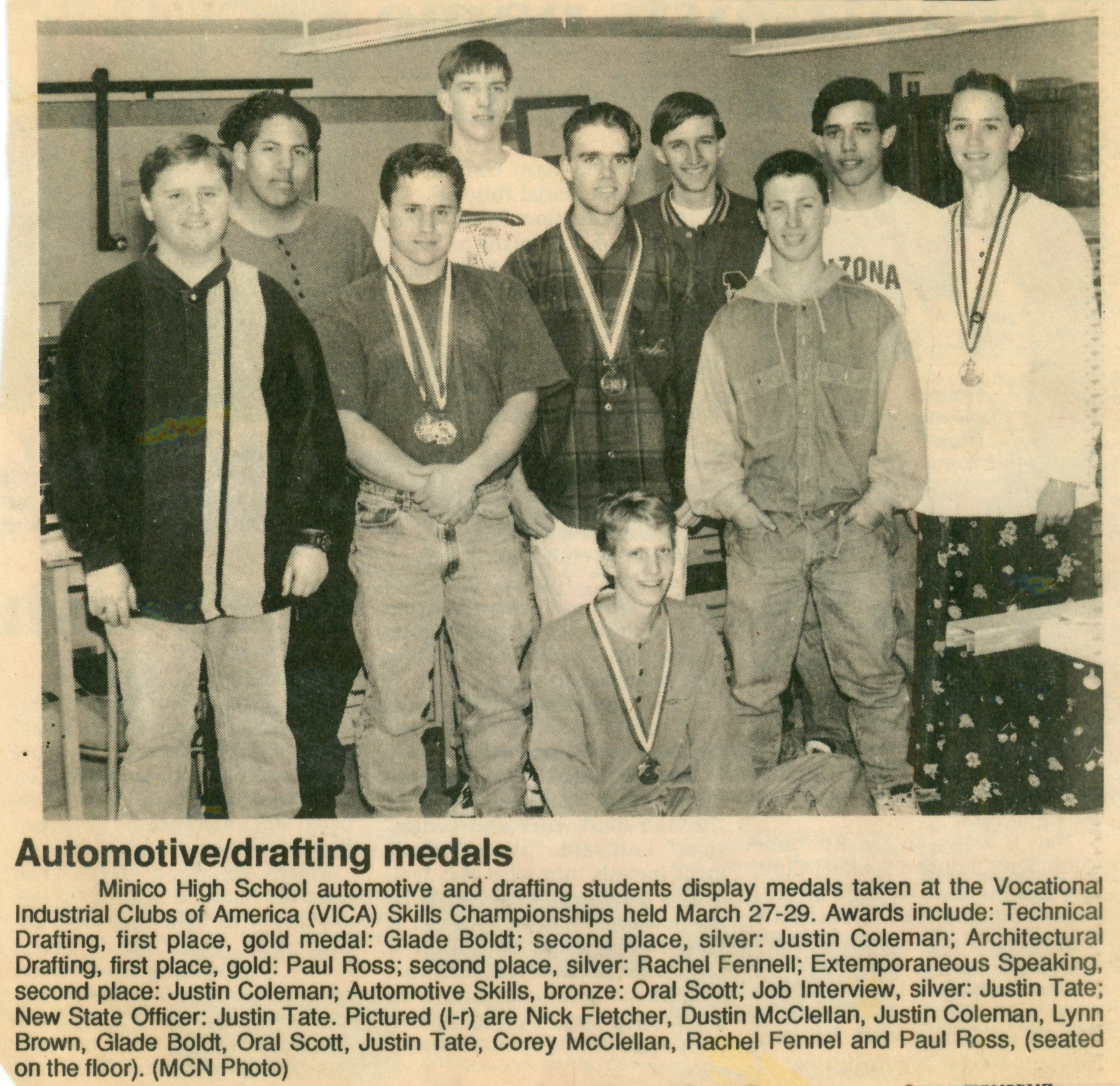 Minico High School automotive and drafting students display medals taken at the Vocational Industrial Clubs of America (VICA) Skills Championships held March 27-29. Awards include: Technical Drafting, first place, gold medal: Glade Boldt; second place, silver: Justin Coleman; Architectural Drafting, first place, gold: Paul Ross; second place, silver: Rachel Fennell; Extemporaneous Speaking, second place: Justin Coleman; Automotive Skills, bronze: Oral Scott; Job Interview, silver: Justin Tate; New State Officer: Justin Tate. Pictured (;-r) are Nick Fletcher, Dustin McClellan, Justin Coleman, Lynn Brown, Glade Boldt, Oral Scott, Justin Tate, Corey McClellan, Rachel Fennell and Paul Ross, (seated on the floor).