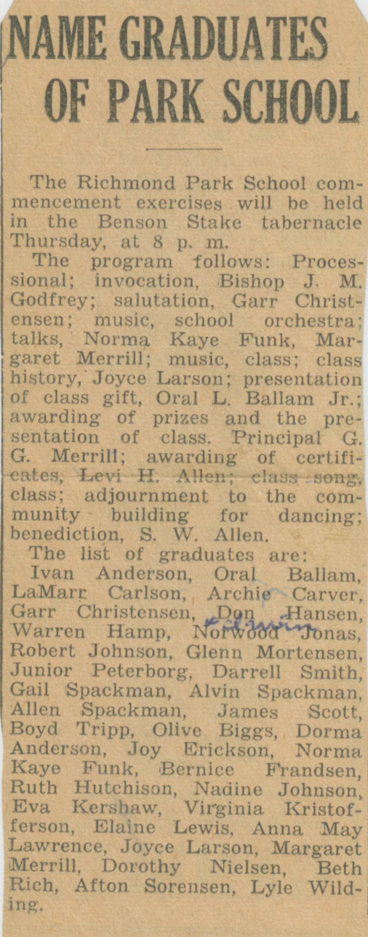“The brothers and sisters are Mrs. George W. Leishman, Mrs. Ada England, Elizabeth Parkinson, and Mrs. Afton Nielsen of Logan, Mrs. Winnifred Jennens of Detroit, Michigan. Dr. George T. Parkinson, Twin Falls, Ida., Mrs. Hazel McAlister of Preston, Dr. Fred B. Parkinson, Cedar City. Mrs. Veda Worley of Salt Lake, Mrs. Karma Parkinson of Franklin, Dr. Wallace Parkinson of San Francisco, Calif., Don Parkinson of Texas, Mrs. Edith Shaw of Provo, and Mrs. Arthur Rallison of Whitney, Idaho.