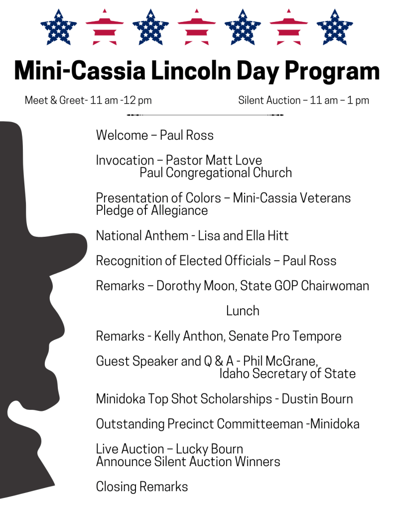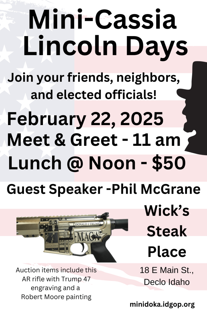 Minidoka and Cassia Counties celebrated their joint Lincoln Days this year on February 22. It was the first time held at Wick’s Steak Place in Declo. Minidoka County Republican Central Committee chaired the Lincoln Days Committee for the two counties. Many thanks to the committee members who organized and orchestrated the event, from the silent auction, donations, auction, meal, location, and more!