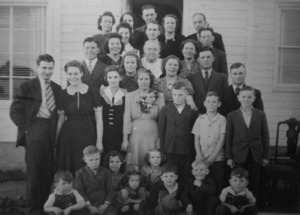 Back (l-r): Eve Baxter Blanch(1904-1992), Voletta Belnap Blanch(1905-2000), Lee Stoker(1910-1998), Laura Blanch Hancock(1903-1963), Wilford Newell Judkins(1881-1956).  5th Row: Alta Bailey, Albert Bailey(1919-2009), Parley Wagstaff(1903-1996).  4th Row: Nina Judkins(1924-2010), Laura Mae Blanch(1873-1942), Eliza Blanch Wagstaff(1908-1992).  3rd Row: Lynn Judkins, Ruth Hancock(1922-1998), Ethel Blanch Stoker(1910-1987), Don Blanch(1913-1997), Heber Hancock(1902-1960).  2nd Row: Newell Judkins(1917-1979), Myreta Judkins, MaryBell Judkins(1919-2000), Sarah Judkins(1899-1974), Keith Stoker(1930-1990), Val Hancock(1929-2010), Gene Hancock.  Front: Bobbie Blanch, Jesse Stoker(1932-1997), Joyce Judkins, LaNae Wagstaff, Evelyn Wagstaff, Duane Wagstaff, Reed Hancock, Jerri Blanch.