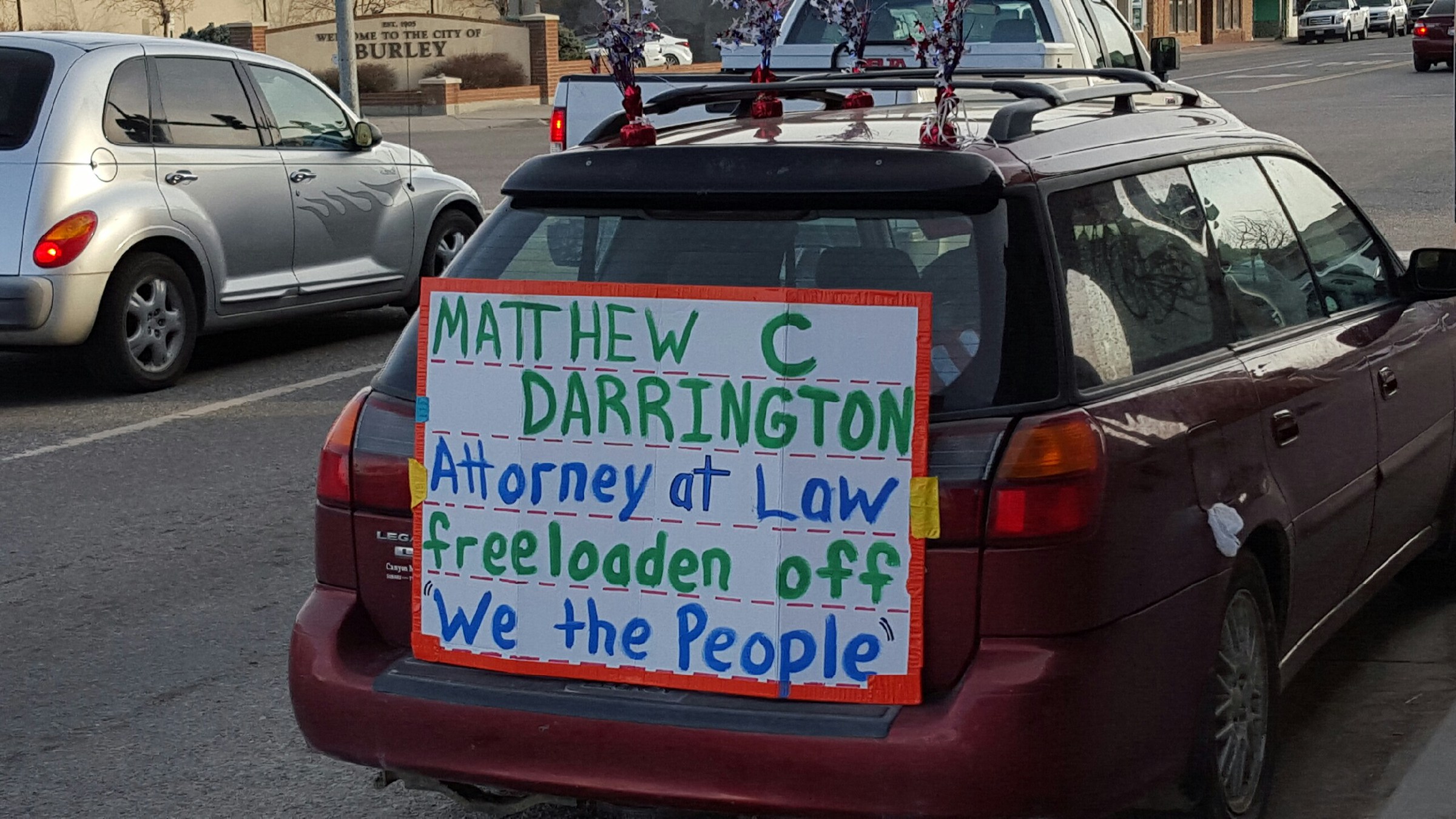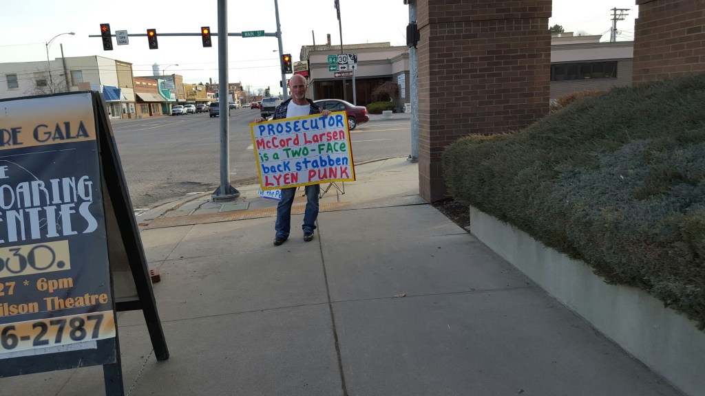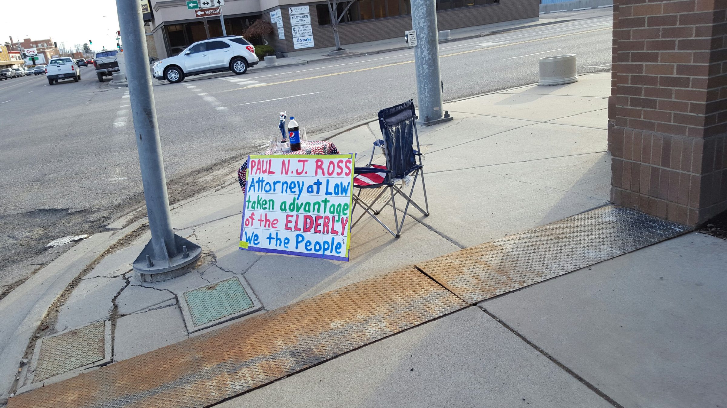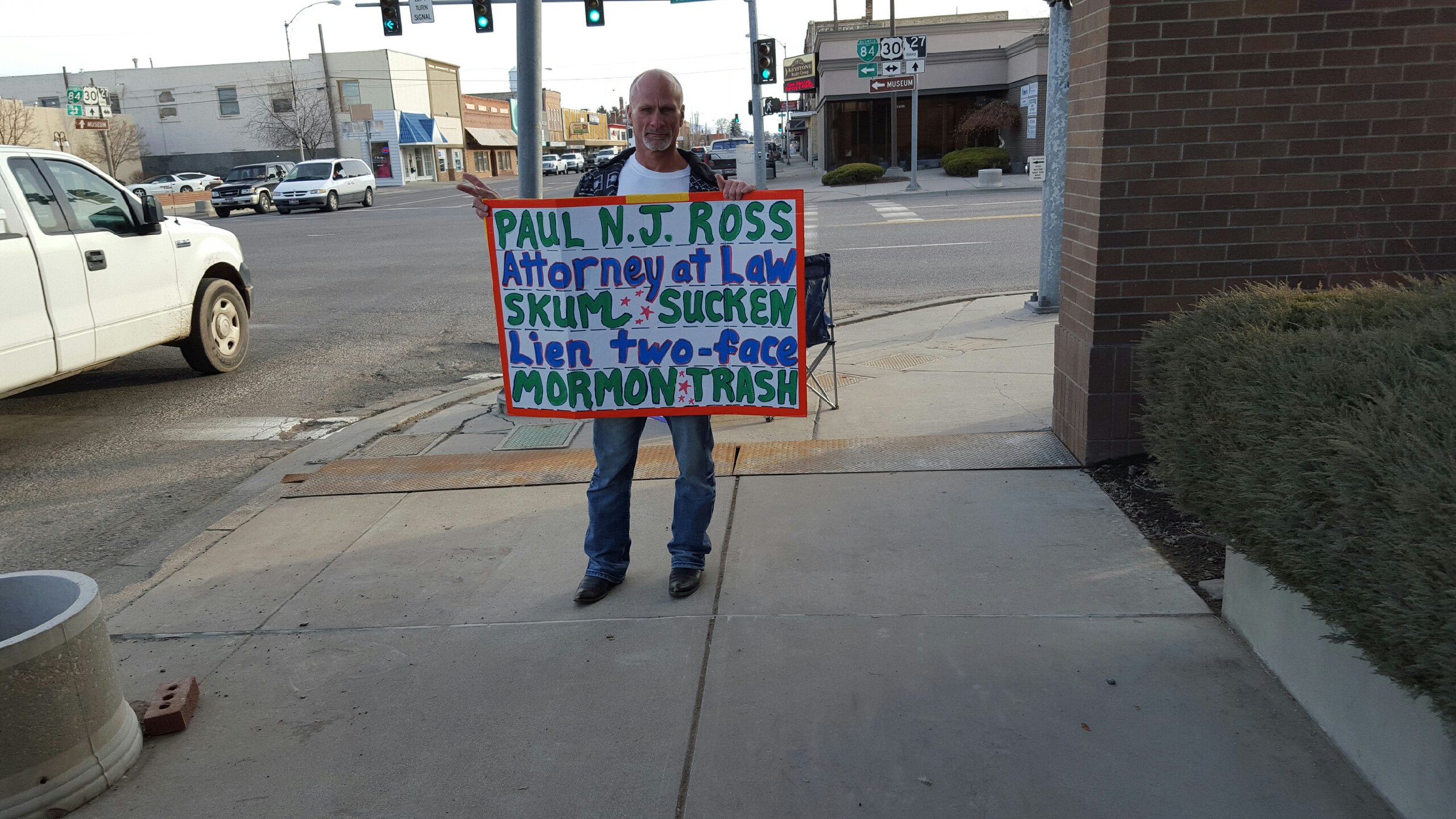 Bret Kelsey with a Ross protest sign in Burley Idaho in 2016