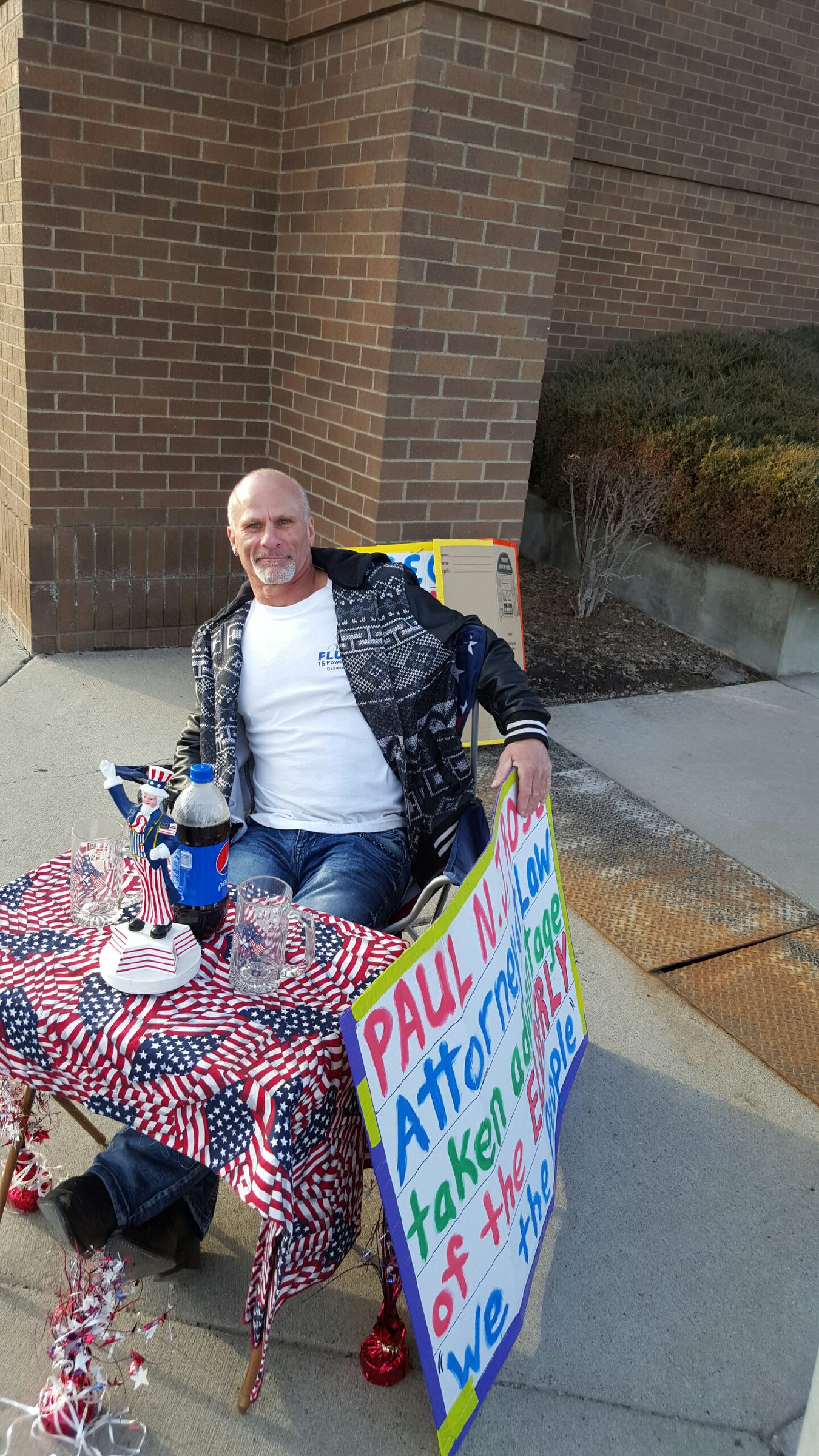 Bret Kelsey with a Paul Ross protest sign in Burley, Idaho