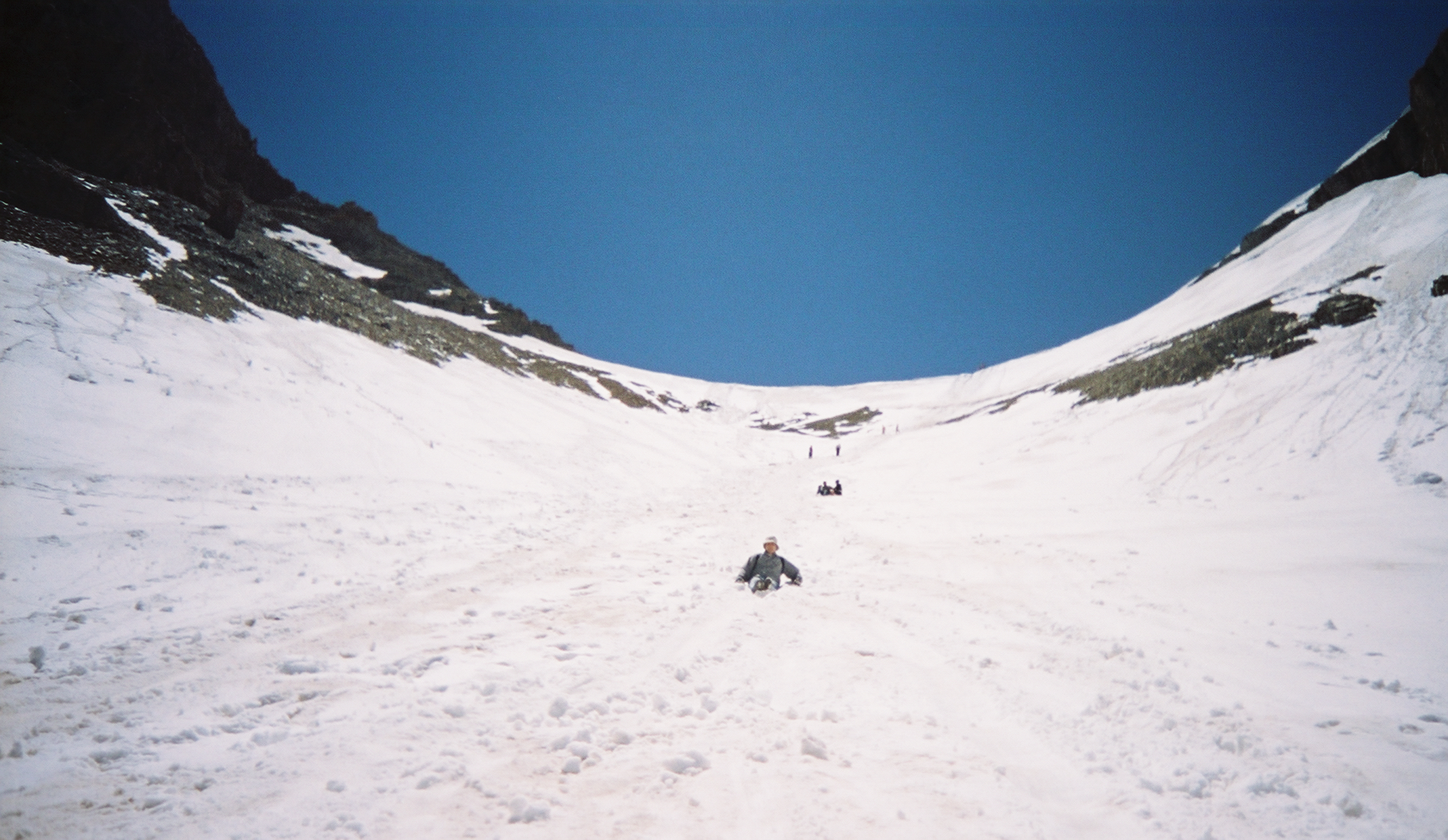 Here is a shot looking down at Emerald Lake below the peak.  We would ride our bags down the “glacier” that goes into the lake.  I have to admit, sitting at the top of the “glacier” looking down and the incline scared me to death.  Something about dropping a couple of thousand feet within a minute or two and the incline that scared me.