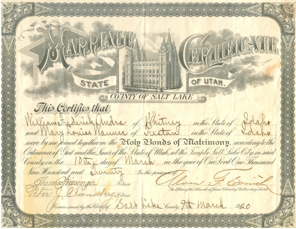 Mary married William Andra 10 March 1920 in the Salt Lake City LDS Temple.