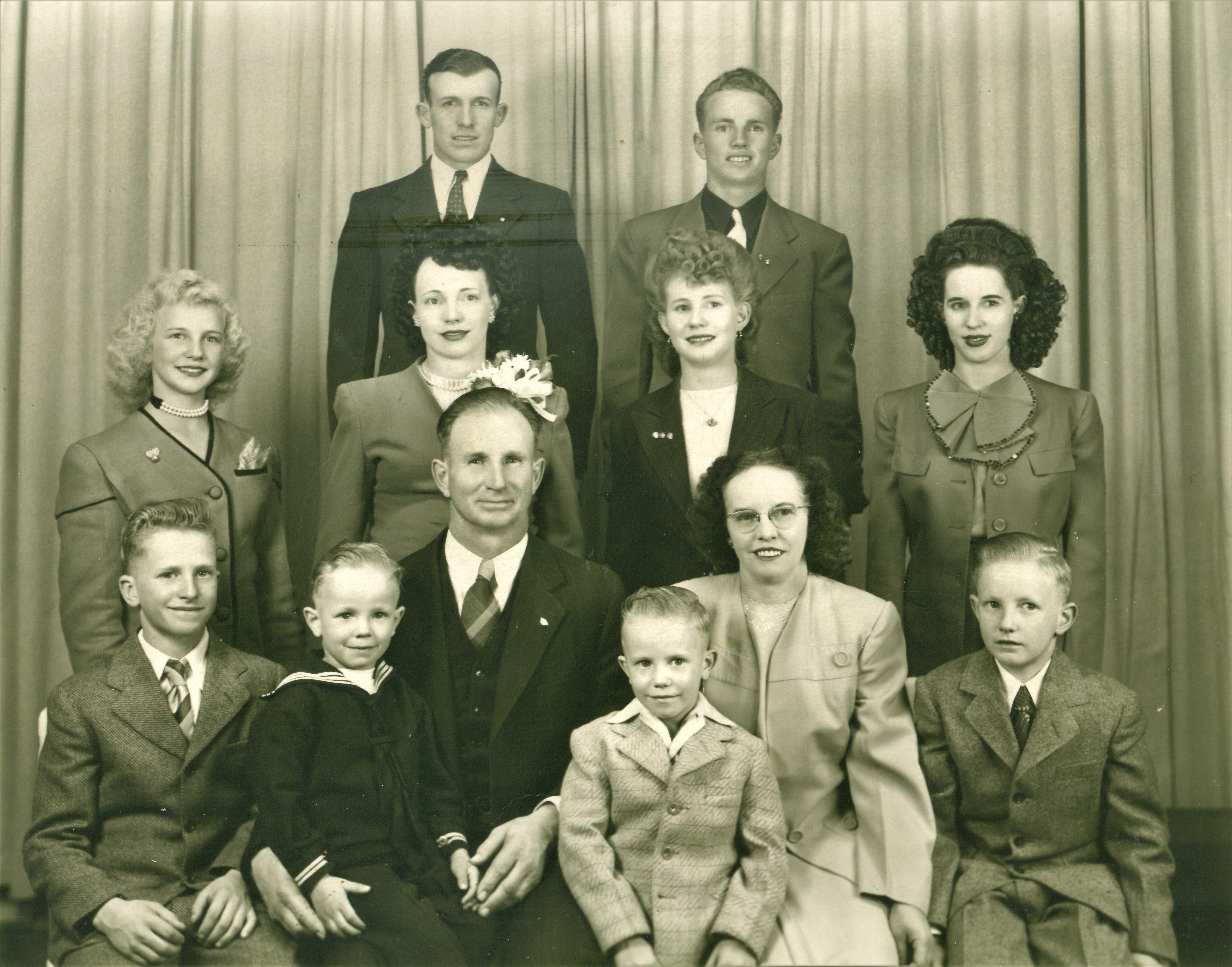 Bill and Mary Andra Family. Back (l-r): William Fredrick Jr, Golden Rulon; Middle Row: Sergene, Mildred “Millie”, Colleen, June; Front: Donald Wanner, Larry Eugene, William Fredrick, Dale, Mary Louise, and Ross Leslie Andra.