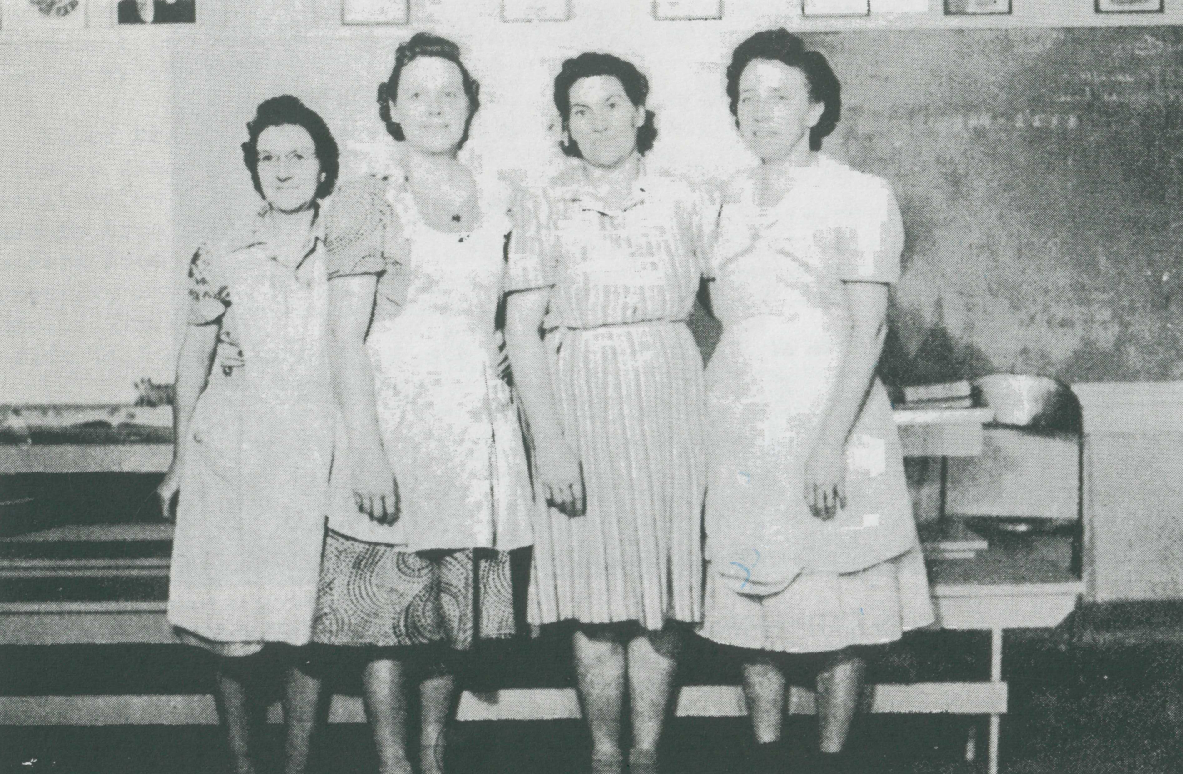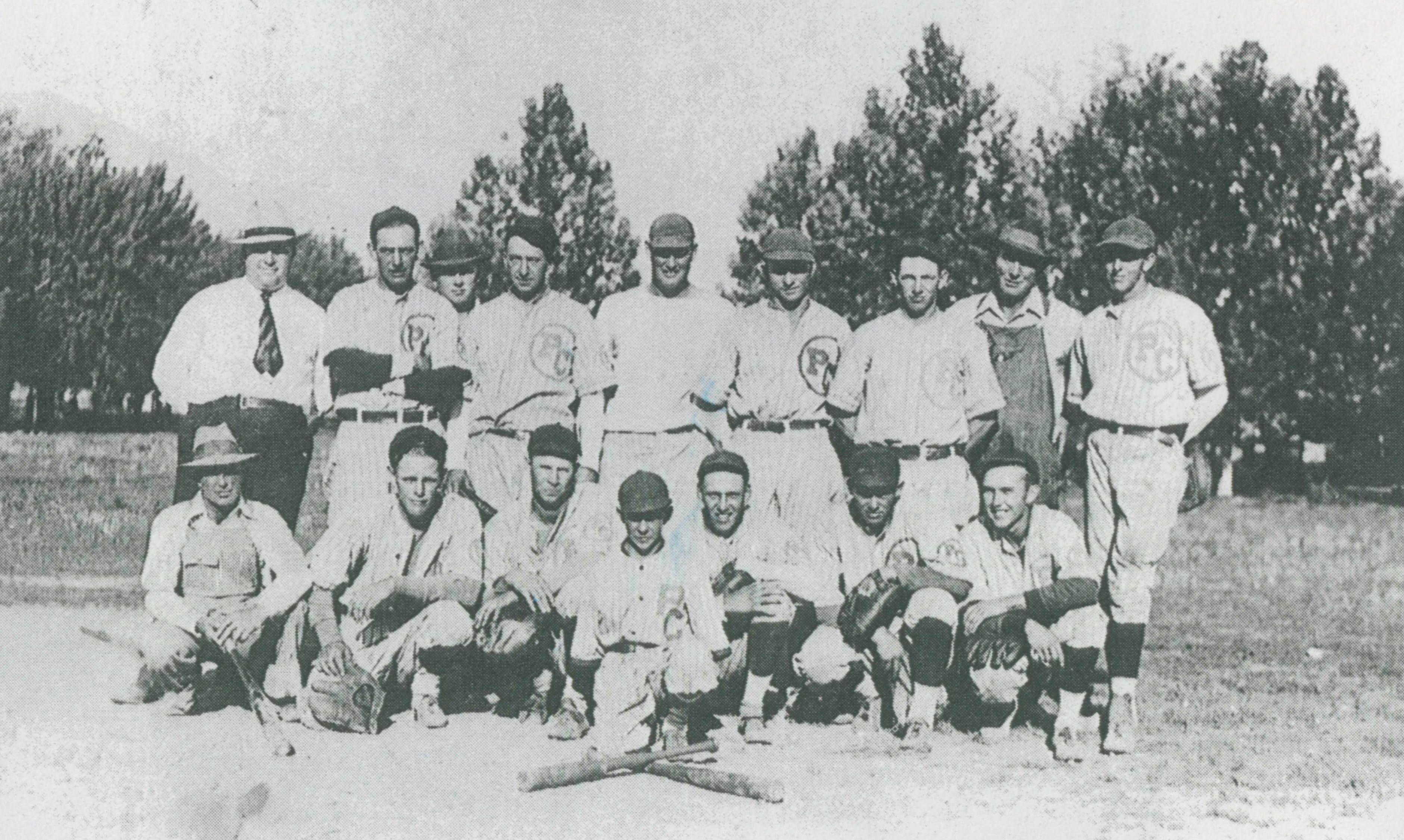 Back (l-r): William Freestone (manager), Norman Carver, Glen Charlton, Fred Singleton, and Elmer Singleton. Middle: Clair Folkman, Dick Skeen, Albert Sharp, Abe Maw, Milo Ross. Front: F. Skeen, Walt Moyes, Arnold Taylor, Lynn Stewart, Theron Rhead.